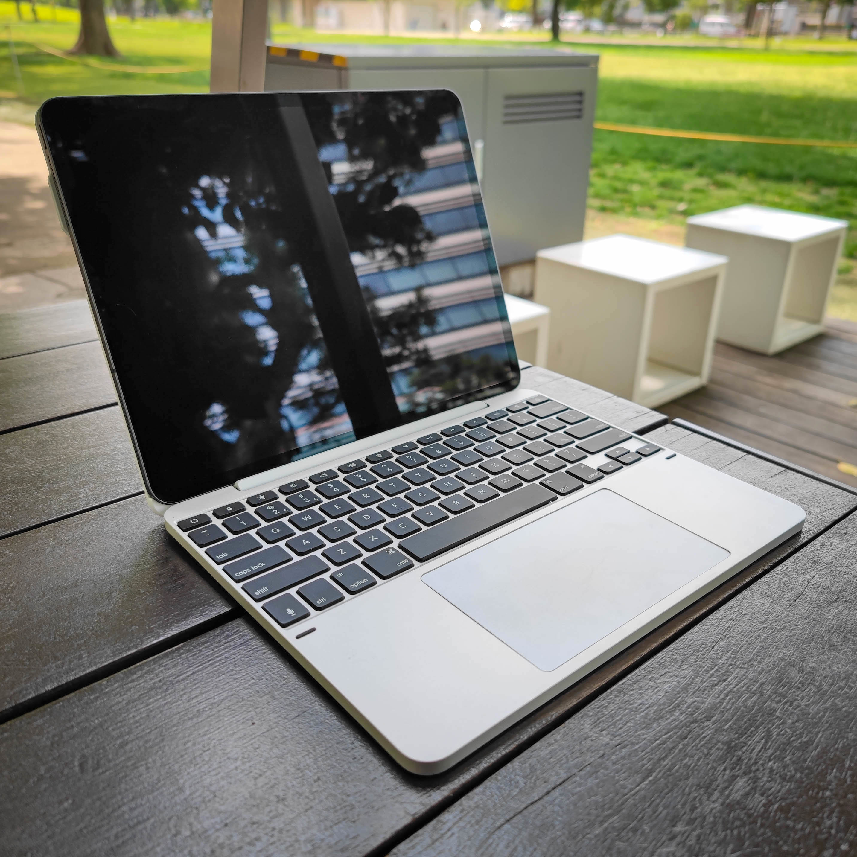 Desigur, avantajul este că adăugați câțiva milimetri grosime în spatele iPad-ului, mai ales dacă (ca mine) nu v-ați deranjat niciodată cu capacele de protecție magnetice furnizate cu tastaturile anterioare Brydge. Cu o grosime de 17 mm și o greutate suplimentară de 970 g, „laptopul” de 12,9 inci obținut cu Max Plus este destul de gros și mai greu decât un MacBook Pro de 13 inci. Cu toate acestea, greutatea ajută la stabilizarea combinației și acceptă o gamă mai largă de unghiuri de vizualizare decât tastatura Magic, în timp ce se simte mult mai premium. Ca persoană înaltă, tastatura magică nu se înclină întotdeauna suficient de departe pentru a fi confortabilă pentru mine, dar nu am o problemă cu acest Brydge. De asemenea, este mai ușor de utilizat pe poală decât o soluție bazată pe kickstand, așa cum se găsește în multe dintre tastaturile iPad ale Logitech.