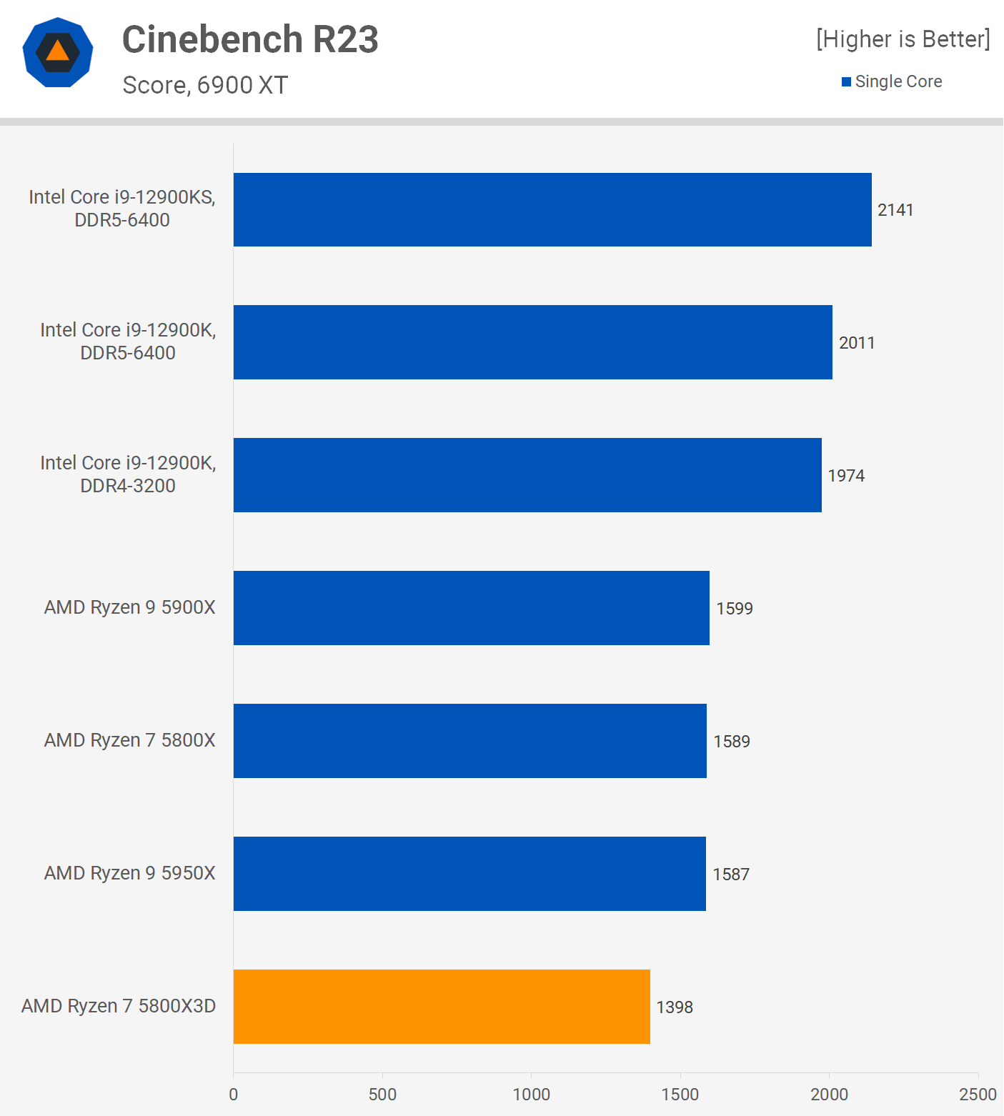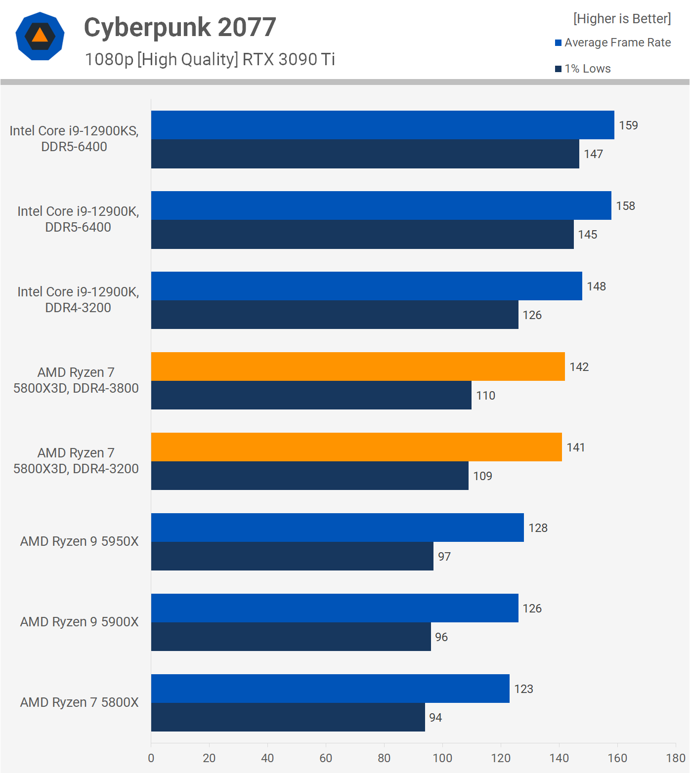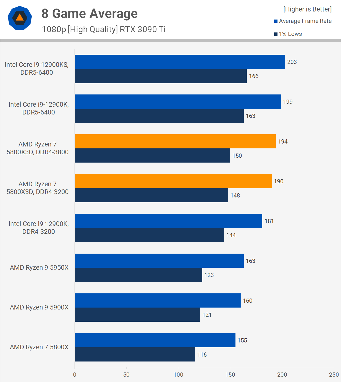 Dar devine mai bine pentru AMD. Chiar și atunci când a armat 12900K cu memorie DDR5-6400 CL32 nebun de scumpă, 5800X3D a fost mai rapid folosind DDR4-3200 și mai rapid din nou cu memoria DDR4-3800. Desigur, marja nu a fost uriașă, dar cu cea mai rapidă memorie stoc pe care o puteți obține pentru fiecare parte, 5800X3D a fost încă cu 6% mai rapid.