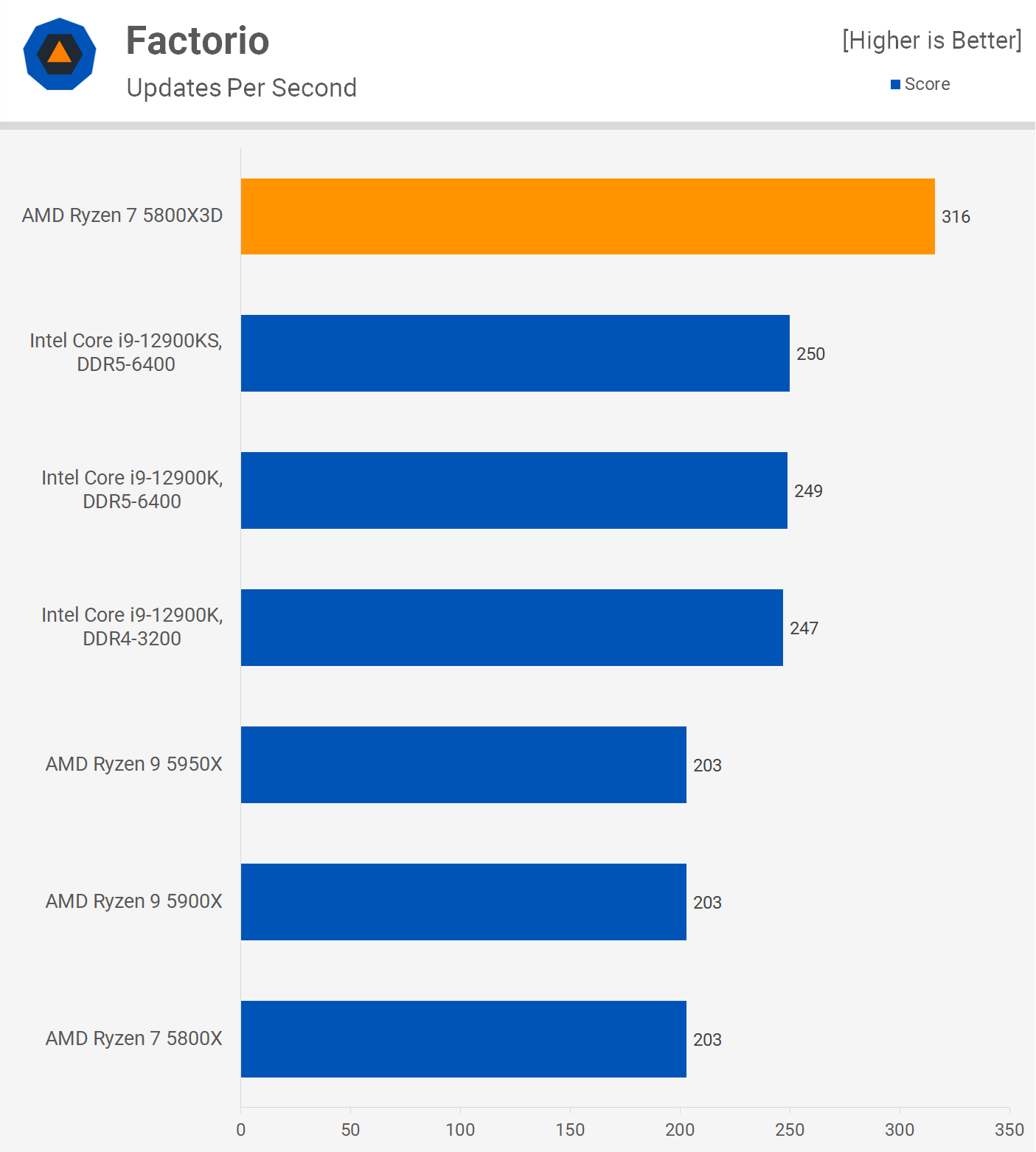 Ca exemplu, spre deosebire de aplicațiile de referință anterioare, ne uităm la o îmbunătățire masivă a Factorio cu 5800X3D. În mod uimitor, noul procesor a fost cu 56% mai rapid decât 5800X și asta însemna că a fost cu 26% mai rapid decât 12900KS de la Intel folosind memorie DDR5-6400.