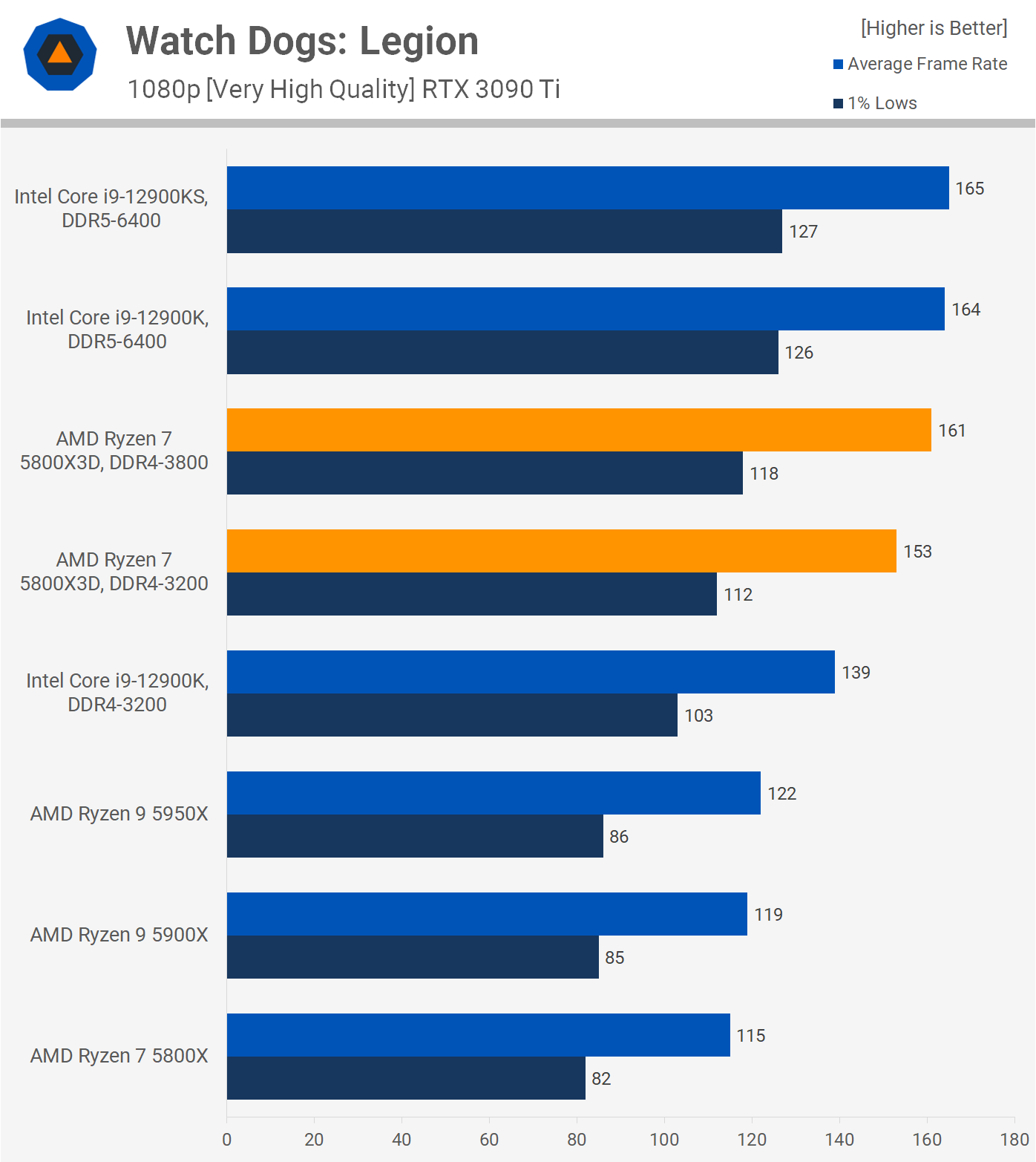 Îmbunătățirea performanței Watch Dogs: Legion este foarte impresionantă. Aici 5800X3D a fost cu 33% mai rapid decât 5800X când folosea aceeași memorie DDR4-3200.