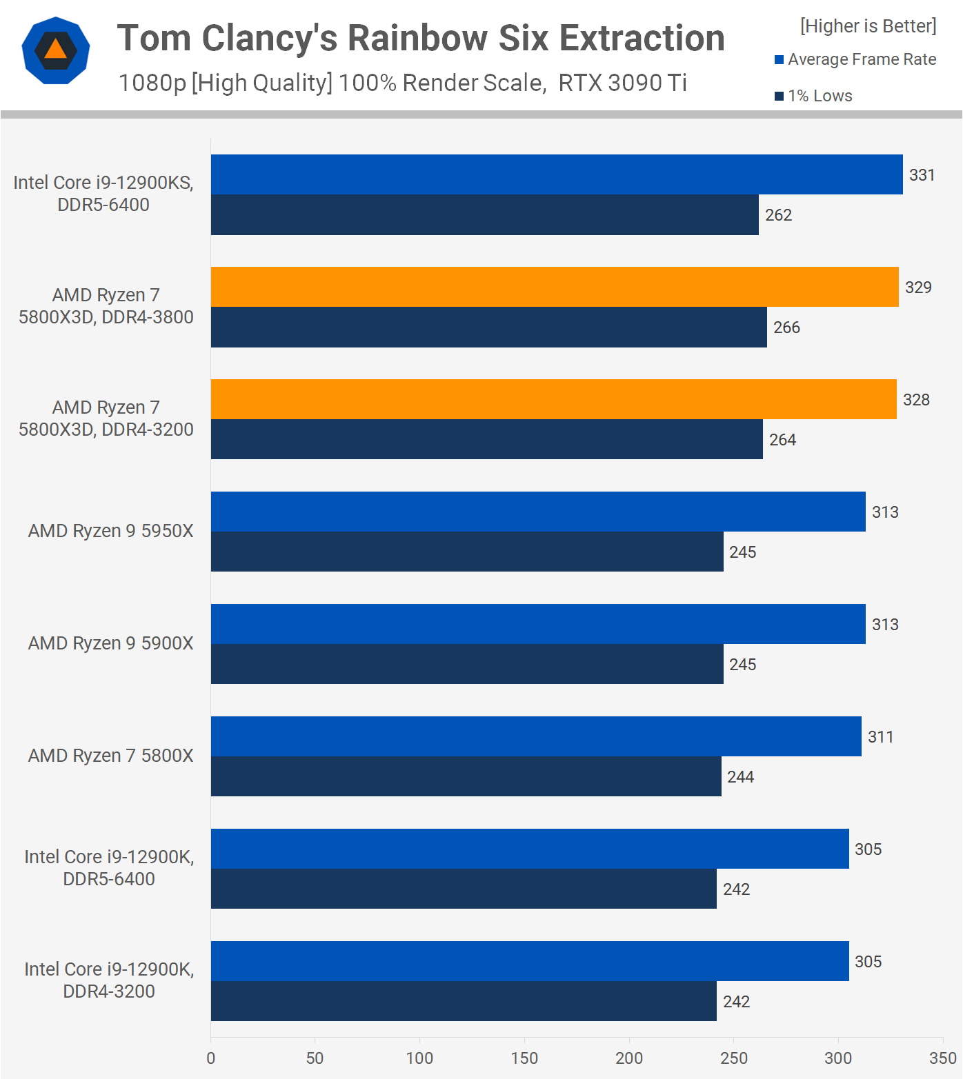Tom Clancy’s Rainbow Six Extraction este, de asemenea, maximizat cu RTX 3090 Ti la 1080p, folosind a doua cea mai înaltă calitate prestabilită cu aceste procesoare high-end. Există puțin spațiu de mișcare, așa cum demonstrează 5800X3D, împreună cu 12900KS, dar vorbim de o îmbunătățire neglijabilă de 6% de la 311 fps la 329 fps.