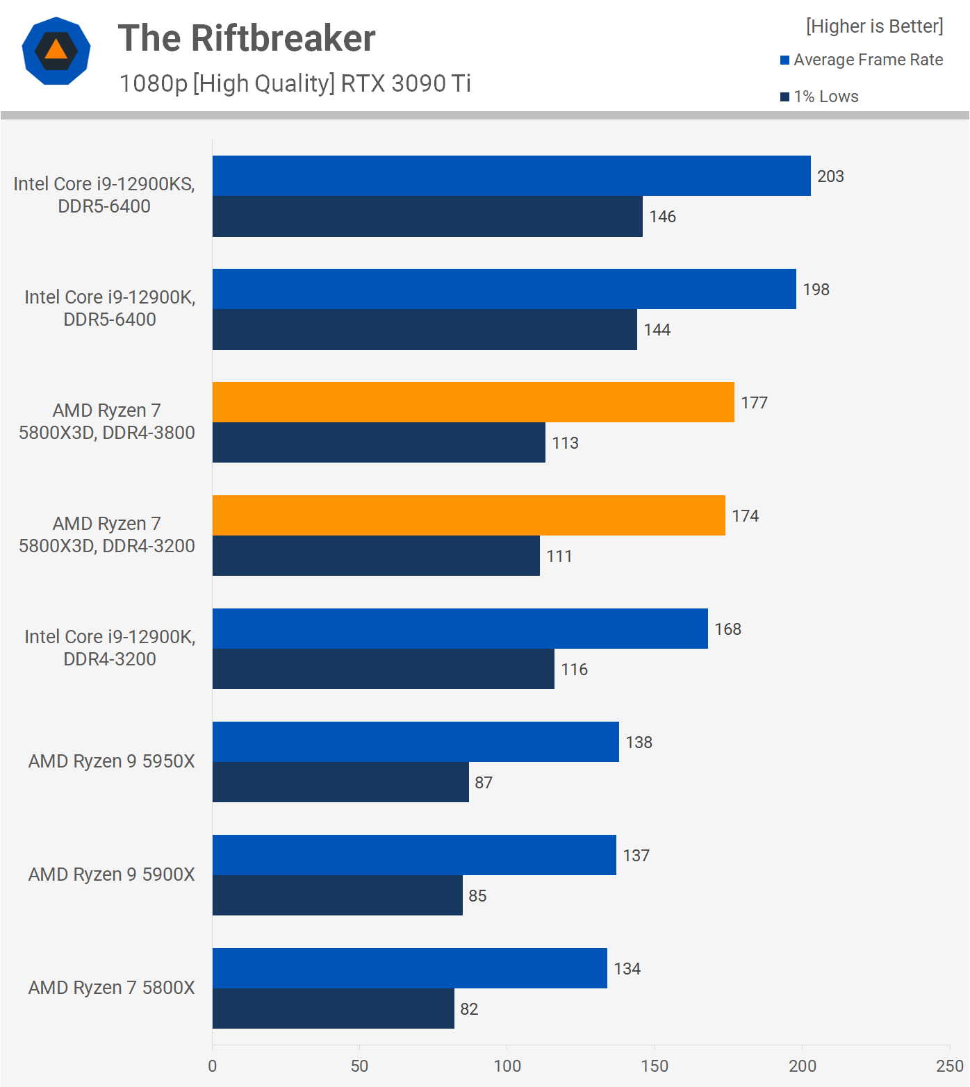 Riftbreaker este un titlu dificil pentru AMD, dar 5800X3D ajută, sporind performanța cu 32% față de 5800X original. Acesta este un rezultat excelent, deoarece folosind aceeași memorie DDR4, 5800X3D și 12900K sunt atunci comparabile în ceea ce privește performanța.