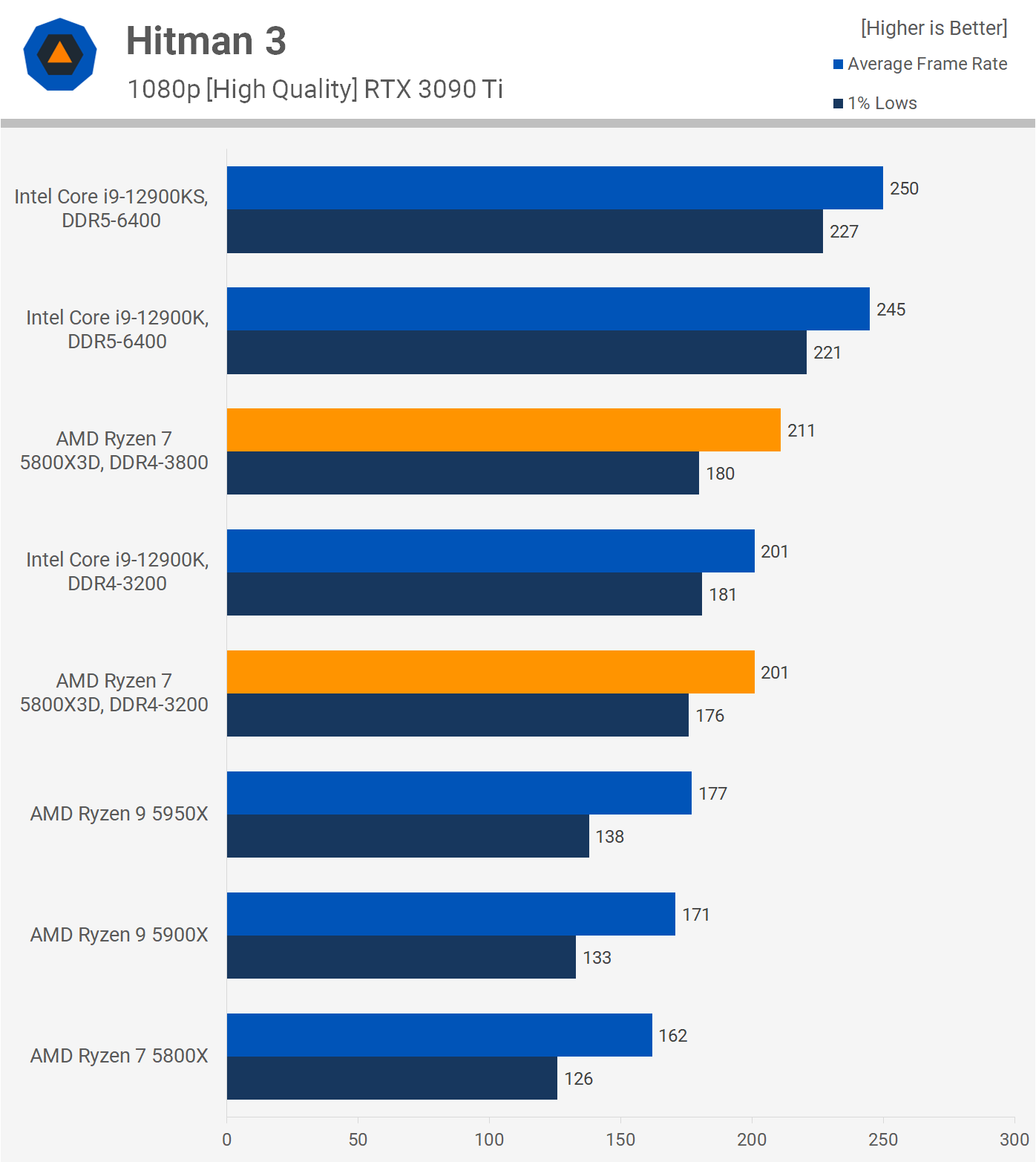Hitman 3 a înregistrat o îmbunătățire a performanței cu 24% de la 5800X la 5800X3D când a comparat rata medie de cadre și o creștere de 40% pentru minimele de 1%.