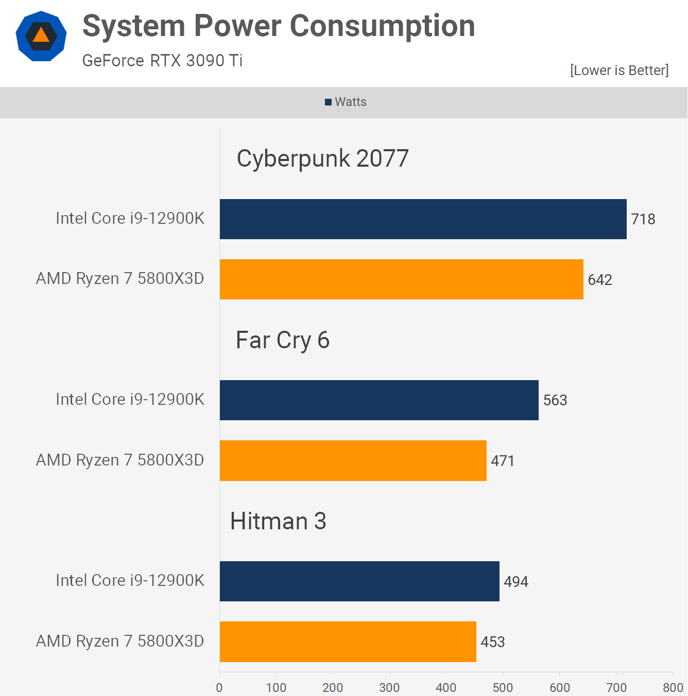 Pentru a compara consumul de energie folosind RTX 3090 Ti, am testat 5800X3D și 12900K în trei jocuri: Cyberpunk 2077, Far Cry 6 și Hitman 3, toate folosind DDR4-3200 pentru ambele procesoare.