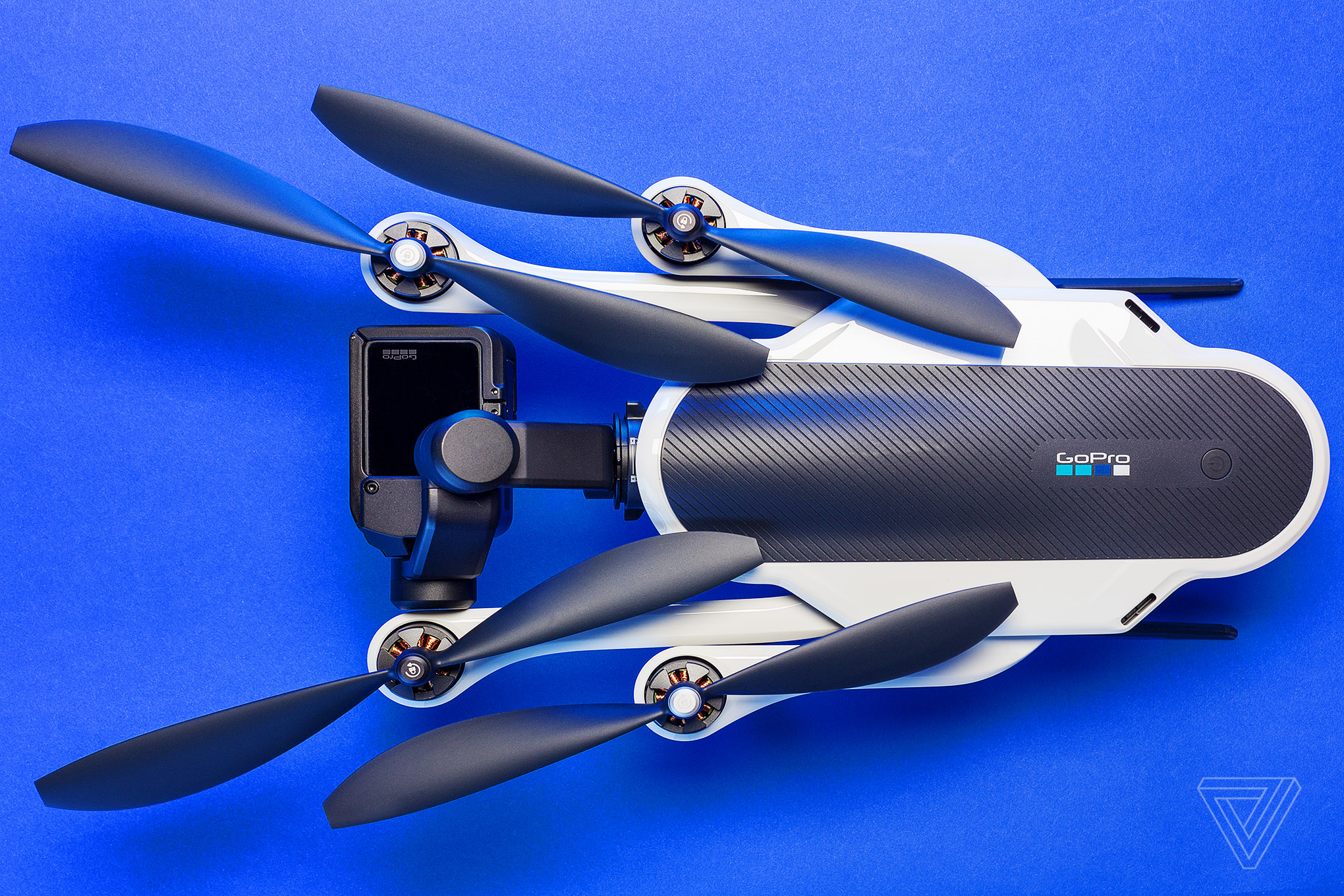 Când GoPro a anunțat Karma, CEO-ul Nick Woodman a îngenuncheat pe scenă pentru o dezvăluire dramatică, desfăcând un rucsac subțire și ridicând drona. Picioarele Karmei se pliază pe burtă, iar aripile se îndoaie pentru a se potrivi strâns pe laturile sale. Camera este poziționată pe nas, extinzându-se în fața corpului în loc să stea dedesubt. Acest lucru face ca Karma să fie lungă și subțire și, în acel moment, ai putea susține că a fost cea mai portabilă dintre dronele serioase de pe piață.