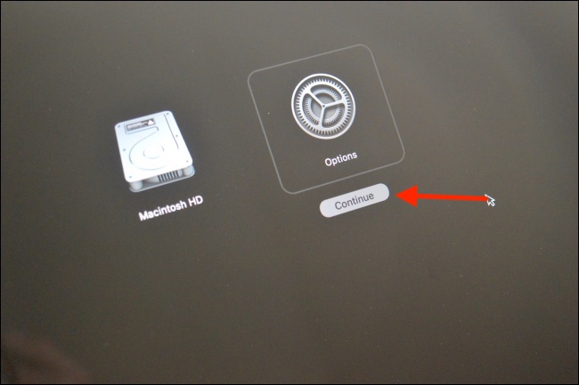 În câteva secunde, veți vedea unitatea de pornire Mac și un buton „Opțiuni”. Selectați butonul „Opțiuni”, apoi faceți clic pe butonul „Continuare”.