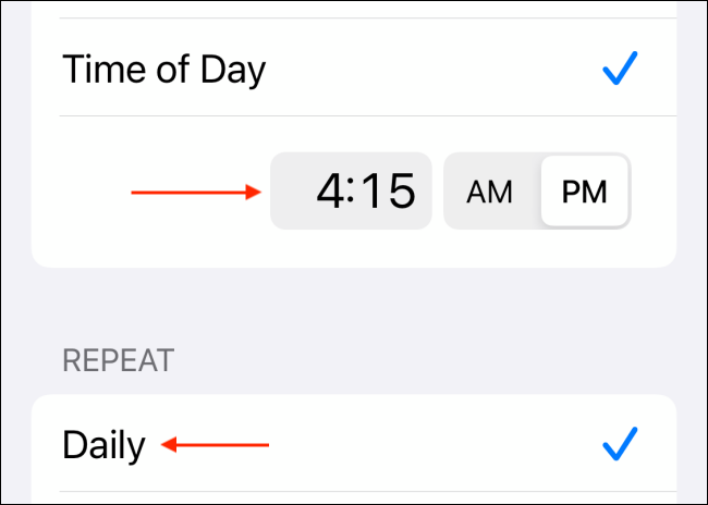 Setați ora pentru automatizare și asigurați-vă că frecvența este setată la „Zilnic” în secțiunea „Repetare”.