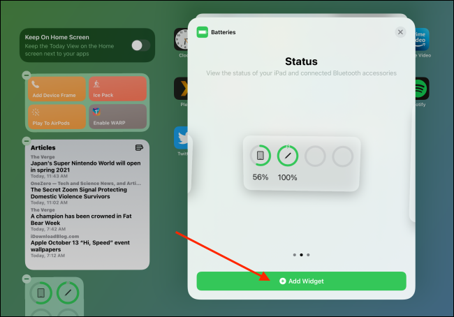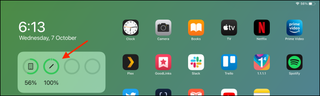 Când utilizați un creion cu iPad-ul dvs., Apple adaugă automat un widget Baterii pe ecranul View Today. Puteți glisa de la stânga la dreapta pe ecranul de pornire al iPad-ului pentru a afișa „Vizualizare astăzi”. Aici, glisați în sus pentru a găsi widgetul „Baterii”.