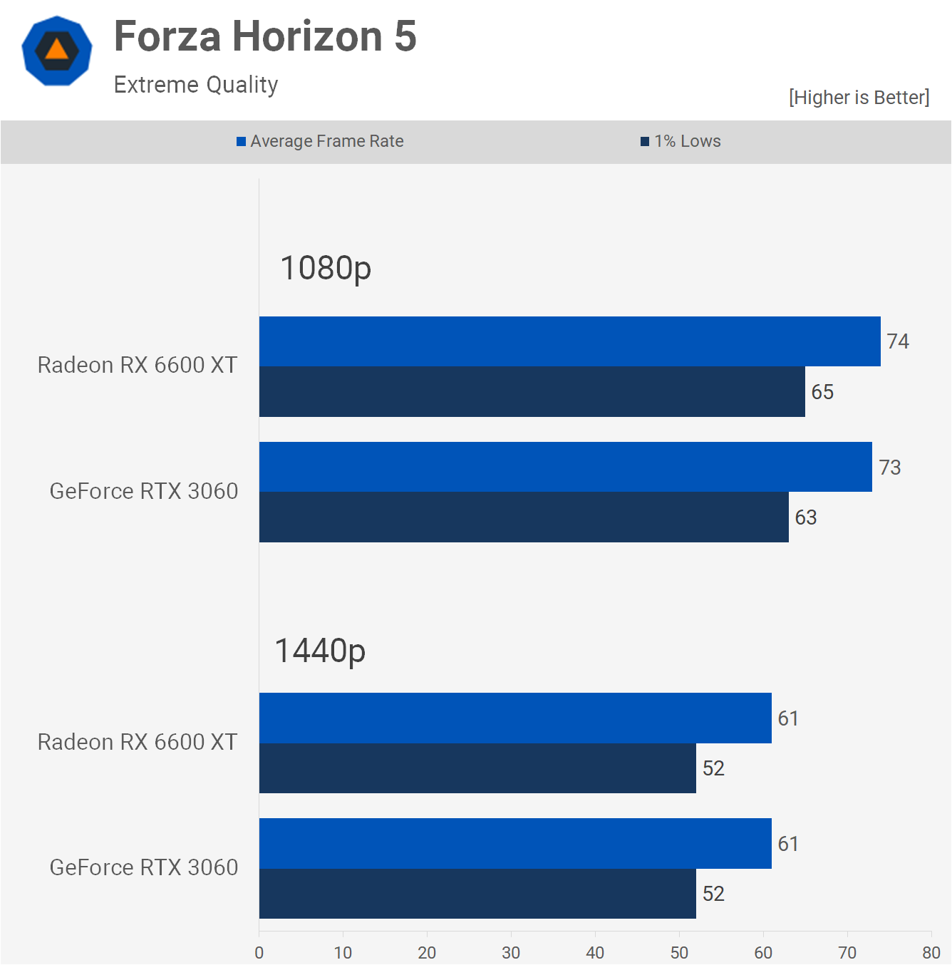 Forza Horizon 5 este un titlu bine optimizat care se joacă bine pe ambele platforme hardware. Folosim presetarea extremă, așa că este la fel de solicitant pe cât devine jocul, dar încă ne uităm la 61 fps în medie de la ambele GPU-uri la 1440p. Performanța a fost foarte similară, fără un câștigător clar.