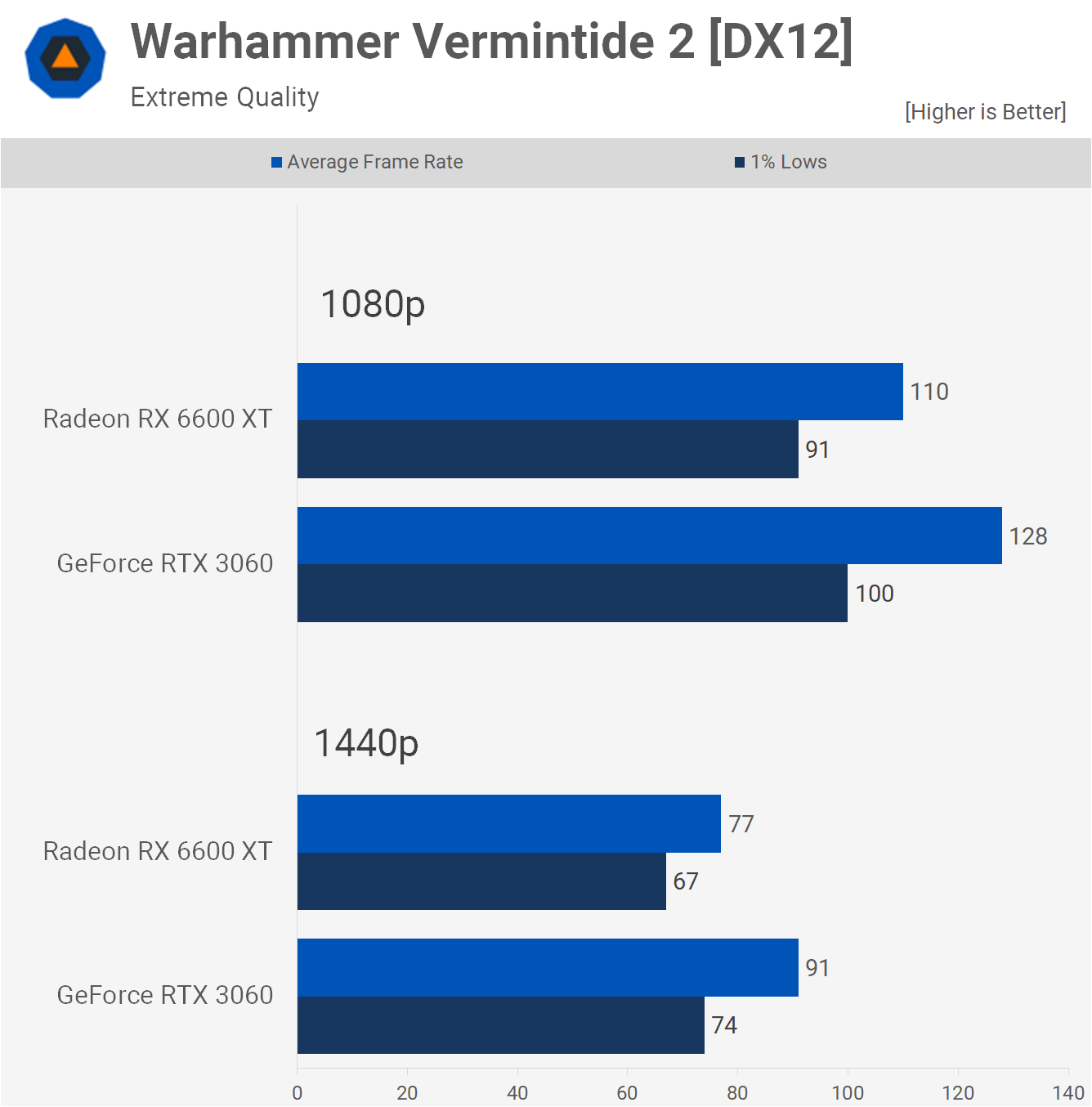În această confruntare, RTX 3060 a fost cu 9% mai rapid la 1080p și cu 14% mai rapid la 1440p, ceea ce reprezintă o marjă semnificativă, deși minimele de 1% sunt practic identice.