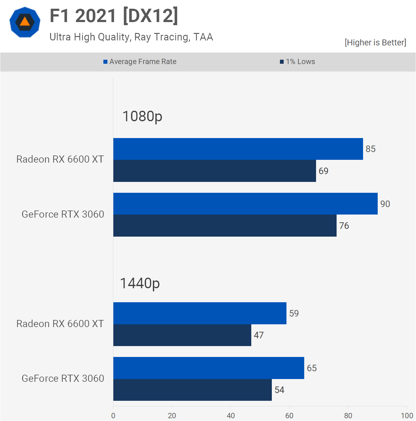 De obicei, GPU-urile Radeon funcționează bine în seria F1, dar F1 2021 permite ray tracing în mod implicit la cele mai înalte setări și, prin urmare, am testat cu funcția activată. Acest lucru îi oferă lui RTX 3060 un avantaj de performanță, oferindu-i un avantaj de performanță de 6% la 1080p și 10% la 1440p. Dezactivarea ray tracing-ului favorizează modelul 6600 XT, dar credem că ar putea la fel de bine să testăm folosind configurația implicită, deoarece așa testăm în mod normal și încă ne uităm la aproximativ 60 fps la 1440p.