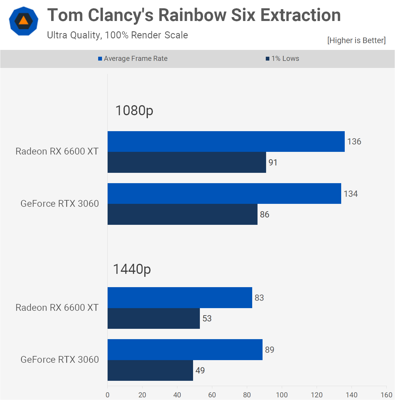 Performanța Rainbow Six Extraction a fost comparabilă cu ambele GPU-uri oferind peste 130 fps la 1080p. RTX 3060 a avansat cu o marjă de 7% la 1440p, dar performanța generală a fost foarte similară.