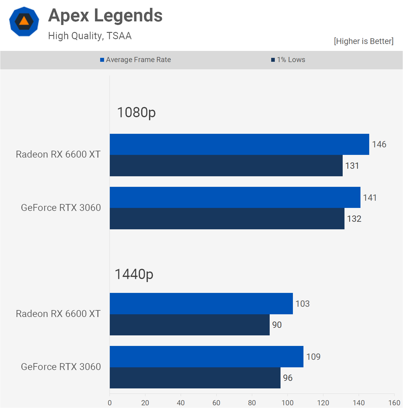 Performanța a fost, de asemenea, similară la testarea cu Apex Legends. Pe scurt, 6600 XT a fost puțin mai rapid la 1080p și apoi puțin mai lent la 1440p. Ambele GPU-uri s-au dovedit destul de puternice pentru acest titlu, oferind peste 100 fps la 1440p folosind cele mai înalte setări de calitate în joc.