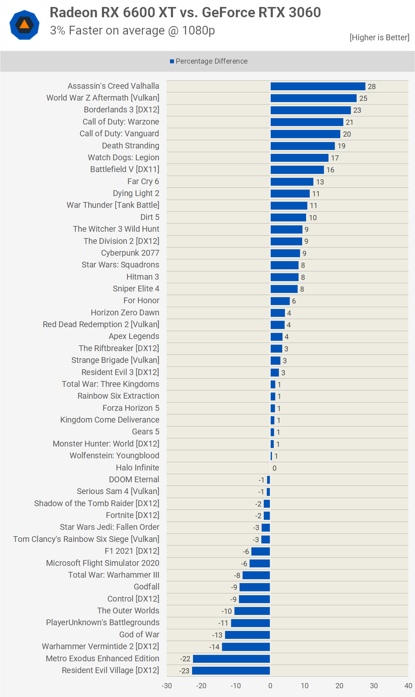 Începând cu datele 1080p, vedem că 6600 XT a fost cu 3% mai rapid în medie, ceea ce înseamnă că sunt practic identici într-o gamă largă de jocuri, deoarece considerăm că orice lucru în limita a 5% este egal. Asta înseamnă că pentru 20 din cele 50 de jocuri testate performanța a fost suficient de aproape de „identică”, cu marje de 4% sau mai puțin.