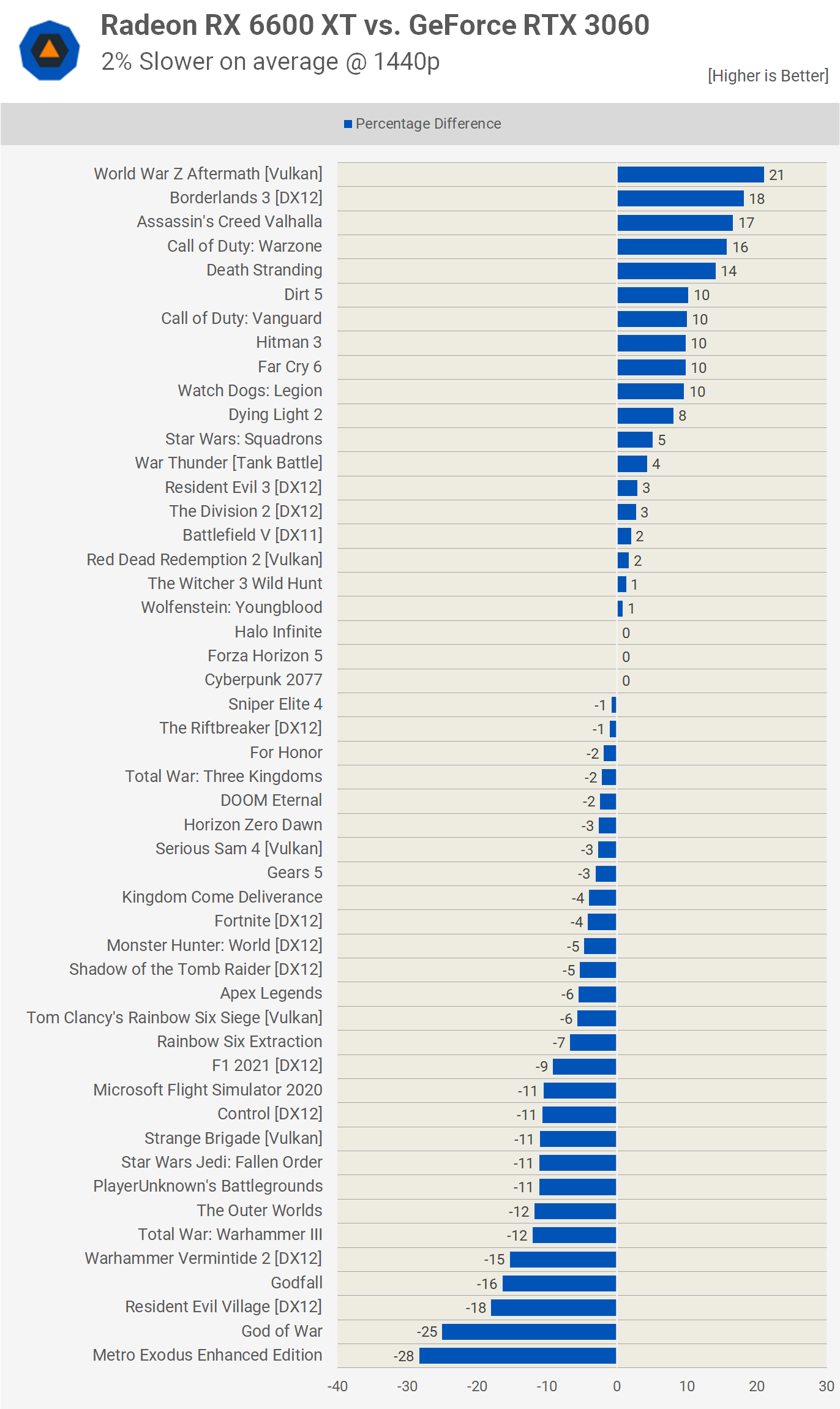 Creșterea rezoluției la 1440p a inversat rezultatele în favoarea Nvidiei, deoarece acum 6600 XT a fost cu 2% mai lent în general, dar din nou această marjă este nesemnificativă. De data aceasta, au existat 23 de jocuri în care marja a fost de 5% sau mai puțin, cu doar trei valori aberante cu câteva jocuri în ambele direcții depășind 20%.