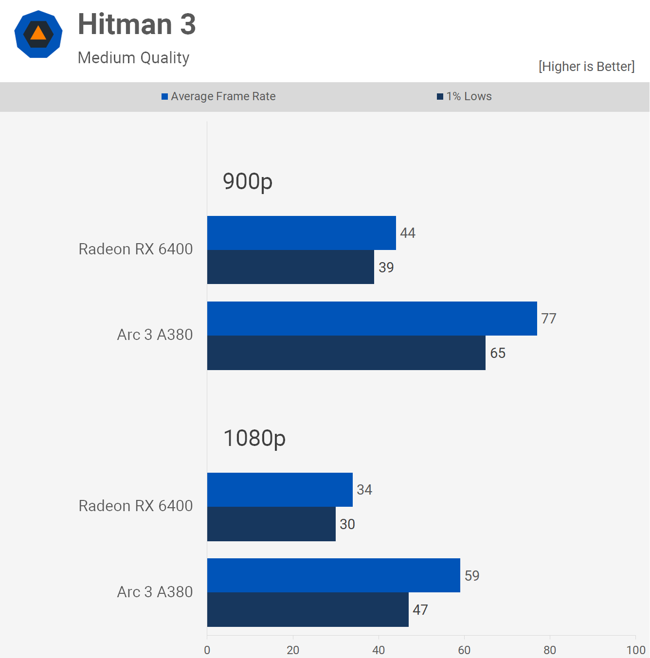 A380 a fost incredibil în comparație cu Radeon 6400 din Hitman 3, oferind cu peste 70% mai multă performanță la ambele rezoluții testate. Jocul a fost vizibil mai fluid și mult mai plăcut cu Arc GPU, atingând 77 fps la 900p și doar sub 60 fps la 1080p, în timp ce RX 6400 a fost bun pentru doar 34 fps.