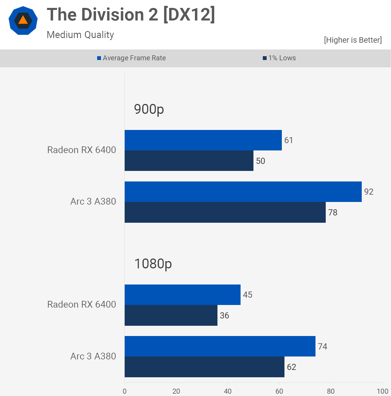 O altă demonstrație grozavă pentru Intel A380 a fost The Division 2, unde a fost cu 64% mai rapid decât Radeon 6400 la 1080p, ducând rata medie a cadrelor de la o întârziere de 45 fps la 74 fps destul de fluide cu 1% minime de 62 fps.