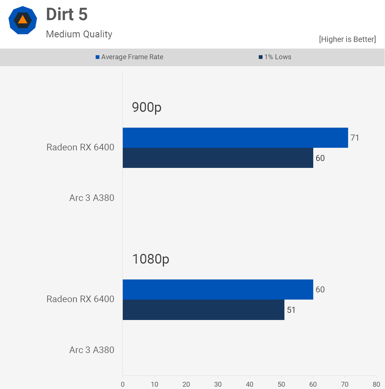 Desigur, aceste rezultate omit Dirt 5, unde A380 nu a reușit să se lanseze, în timp ce jocuri precum God of War și CSGO au suferit probleme de stabilitate.
