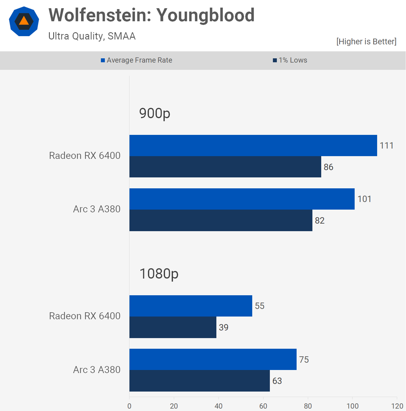 Wolfenstein: Youngblood a fost un alt titlu de succes pentru Arc GPU. Atât A380, cât și RX 6400 au funcționat foarte bine la 900p, cu peste 100 fps în medie, deși GPU-ul Radeon a ajuns să iasă în frunte cu o marjă de 10%.