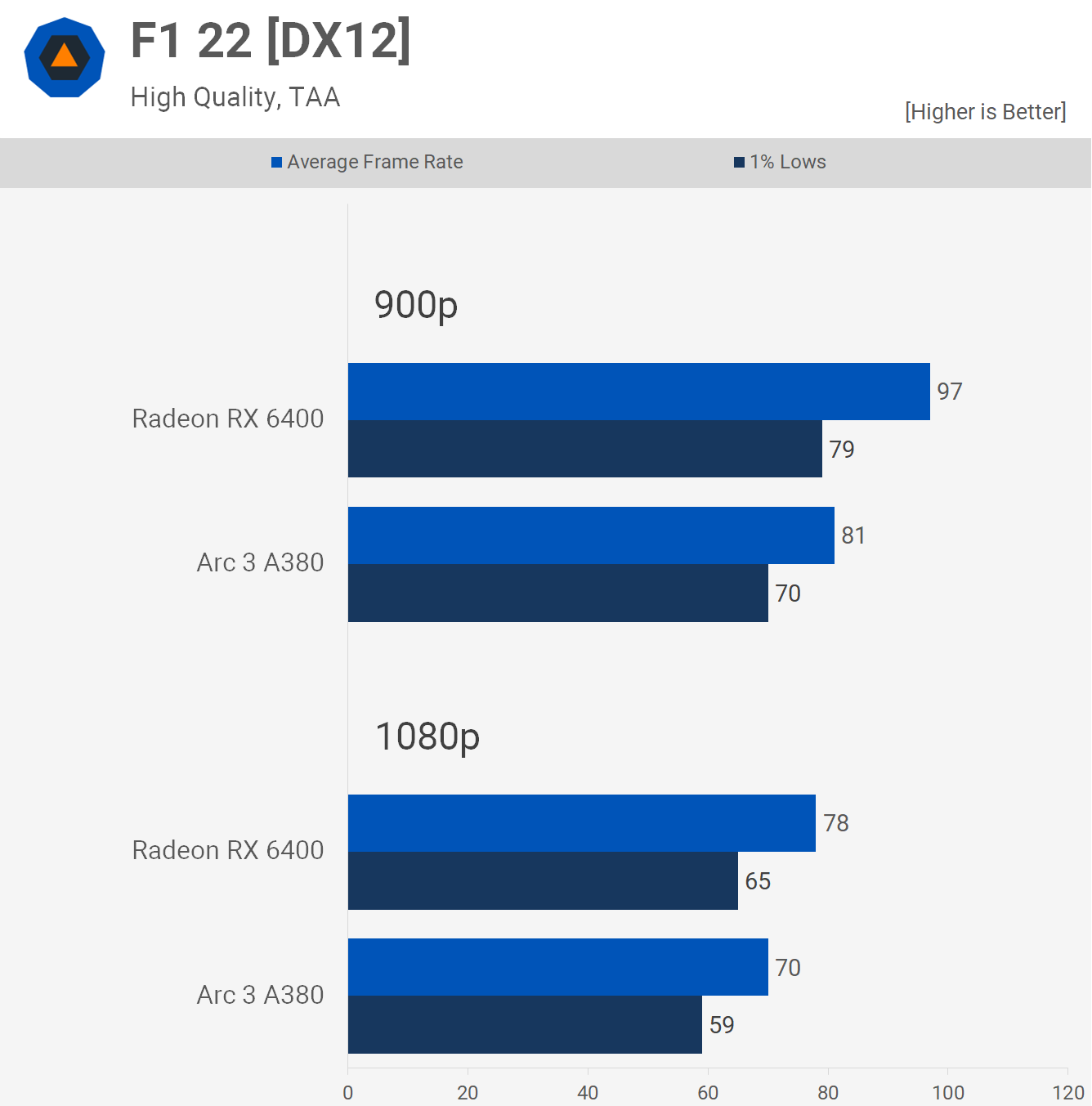 Este o poveste similară în F1 22, aici A380 a fost cu 10% mai lent la 1080p, ceea ce nu este prea rău, deși marja de 16% pe care a urmat-o de 900p începe să ajungă acolo, iar pentru cei cu monitoare cu rată de reîmprospătare ridicată, Cu siguranță voi observa diferența aici.