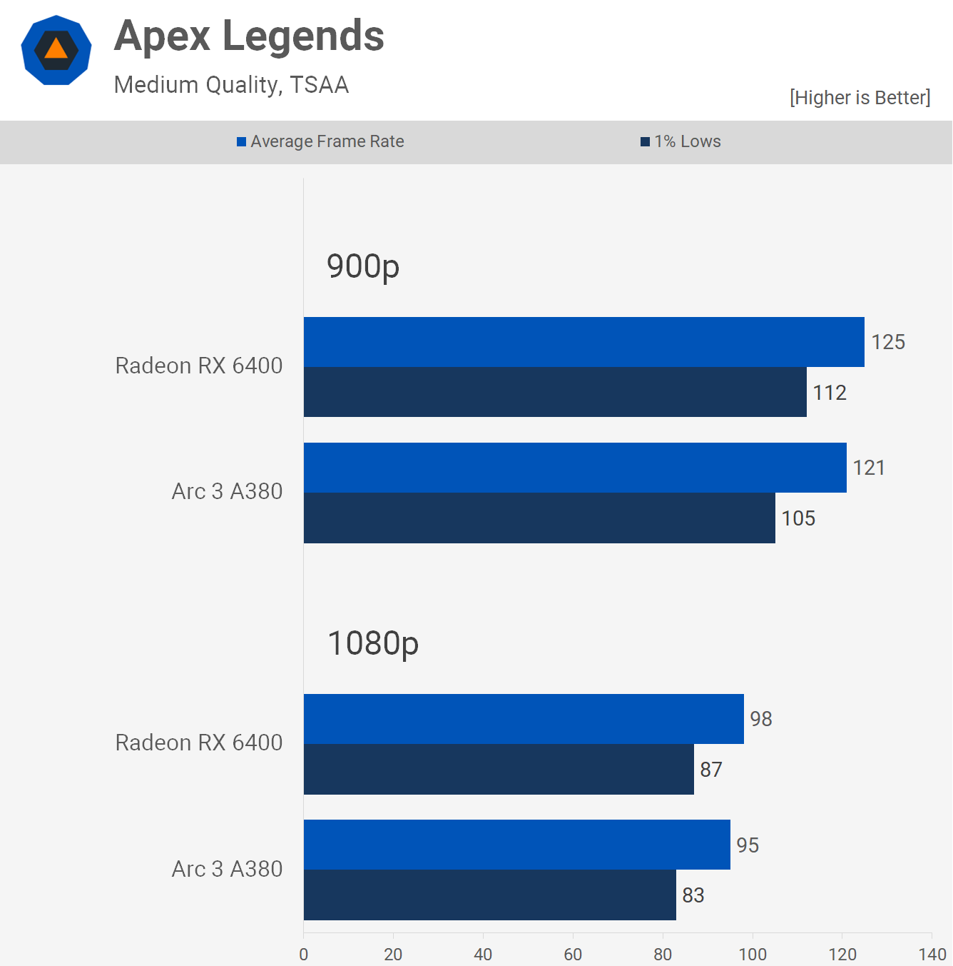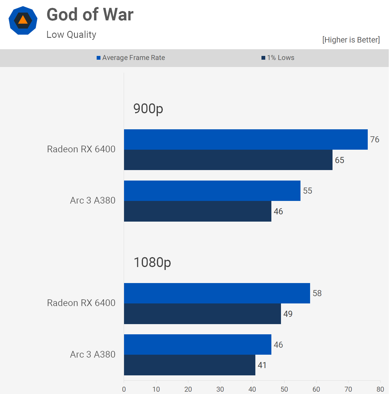 La 900p, GPU-ul Intel a fost cu 3% mai rapid, iar apoi la 1080p, performanța medie a ratei de cadre a fost aproape aceeași, deși A380 a oferit reduceri de 1% cu 20% mai puternice.