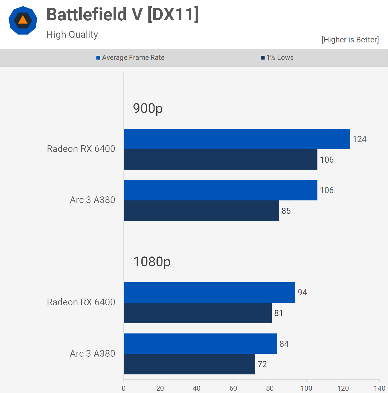 Battlefield V a funcționat mult mai bine folosind GPU-ul Radeon la 900p, A380 a fost cu 15% mai lent când se uită la rata medie a cadrelor și cu 20% mai lent pentru minimele de 1%.