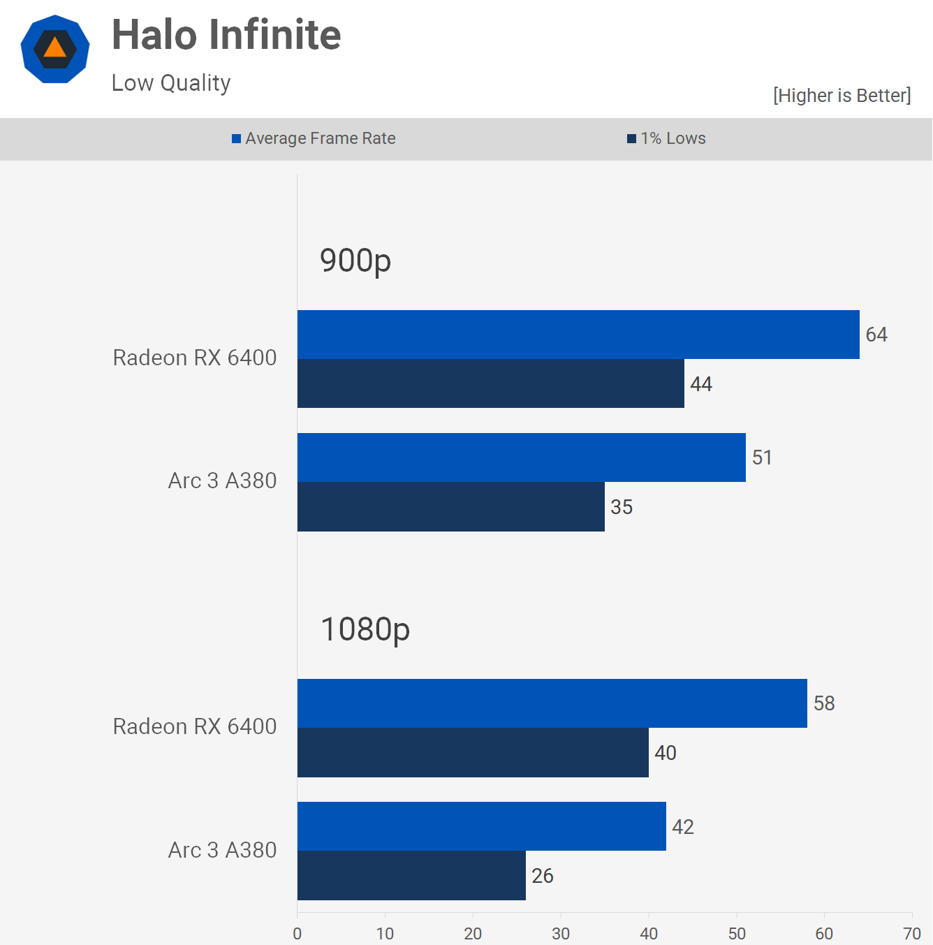 Halo Infinite, folosind setările de cea mai scăzută calitate, a văzut că A380 nu reușește să atingă 60 fps, chiar și la 900p, așa că performanța generală a fost dezamăgitoare, mai ales având în vedere că la 1080p Radeon 6400 a fost cu aproape 40% mai rapid.