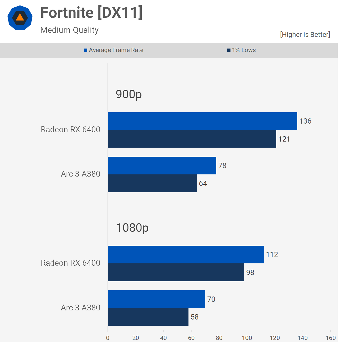 Un alt titlu în care Intel A380 s-a luptat a fost Fortnite. Desigur, aceste rate de cadre sunt redate, dar nu sunt ideale pentru un shooter competitiv, iar ceea ce am primit de la Radeon 6400 a fost semnificativ mai impresionant și mult mai de dorit pentru cei dintre voi care au un monitor cu rată de reîmprospătare ridicată.