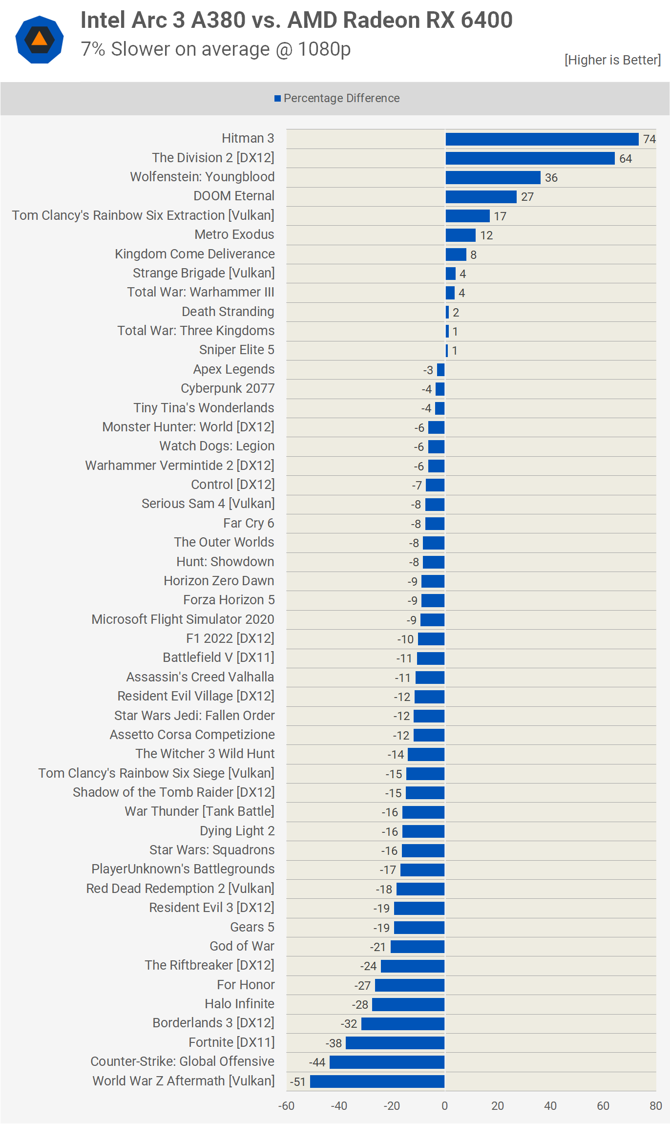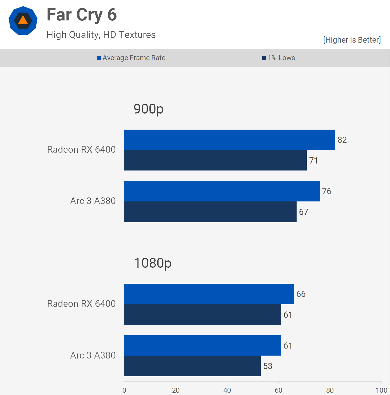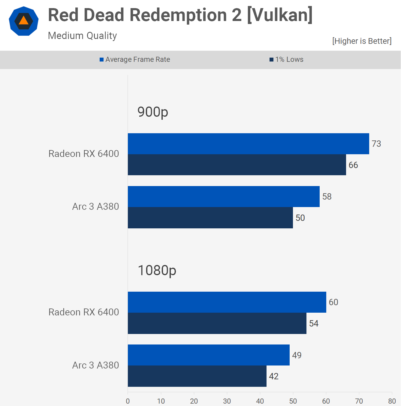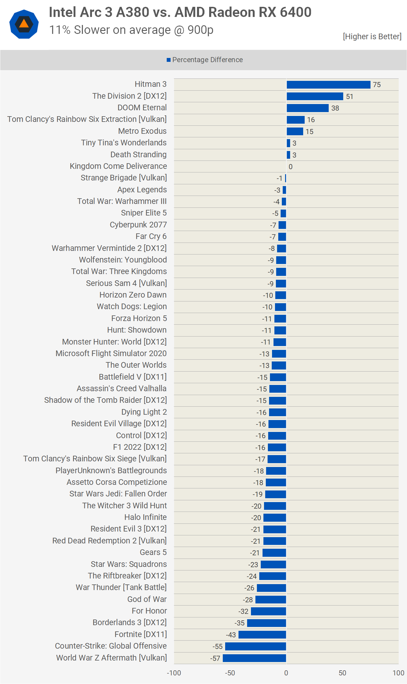 Cu toate acestea, DirectX 12 părea să ruleze fără probleme, așa că A380 a fost evaluat folosind DX12, în timp ce RX 6400 a fost testat folosind Vulkan. Rezultatul final este un avantaj de performanță de 26% pentru Radeon la 900p și 22% la 1080p.