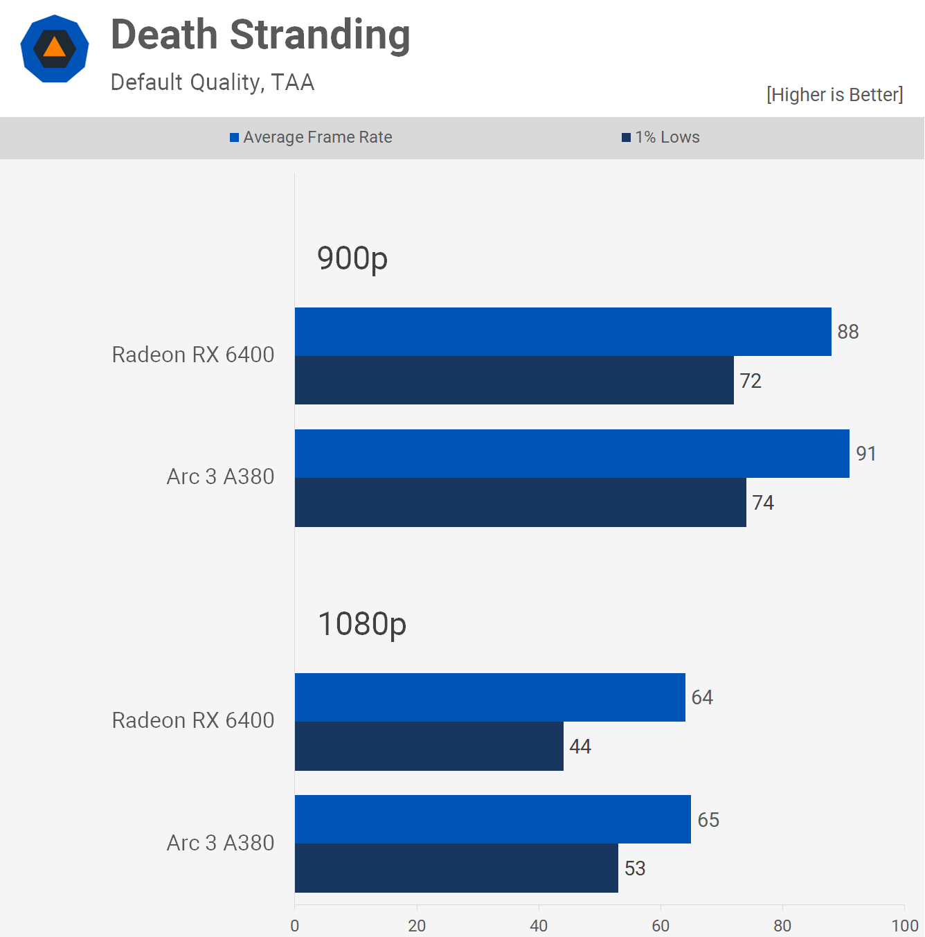 Începând cu Death Stranding, găsim performanțe comparabile între aceste două GPU-uri, ceea ce nu este un rezultat rău pentru A380 dacă ajunge să coste cu ~50 USD mai puțin decât Radeon 6400.