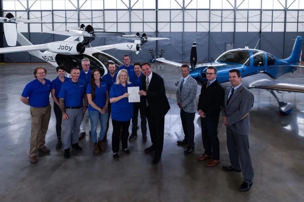 Echipa de operațiuni aeriene a lui Joby s-a fotografiat primind certificatul de transport aerian Partea 135 al companiei de la Biroul districtual de standarde de zbor din San Jose al FAA. Imagine: Joby Aviation