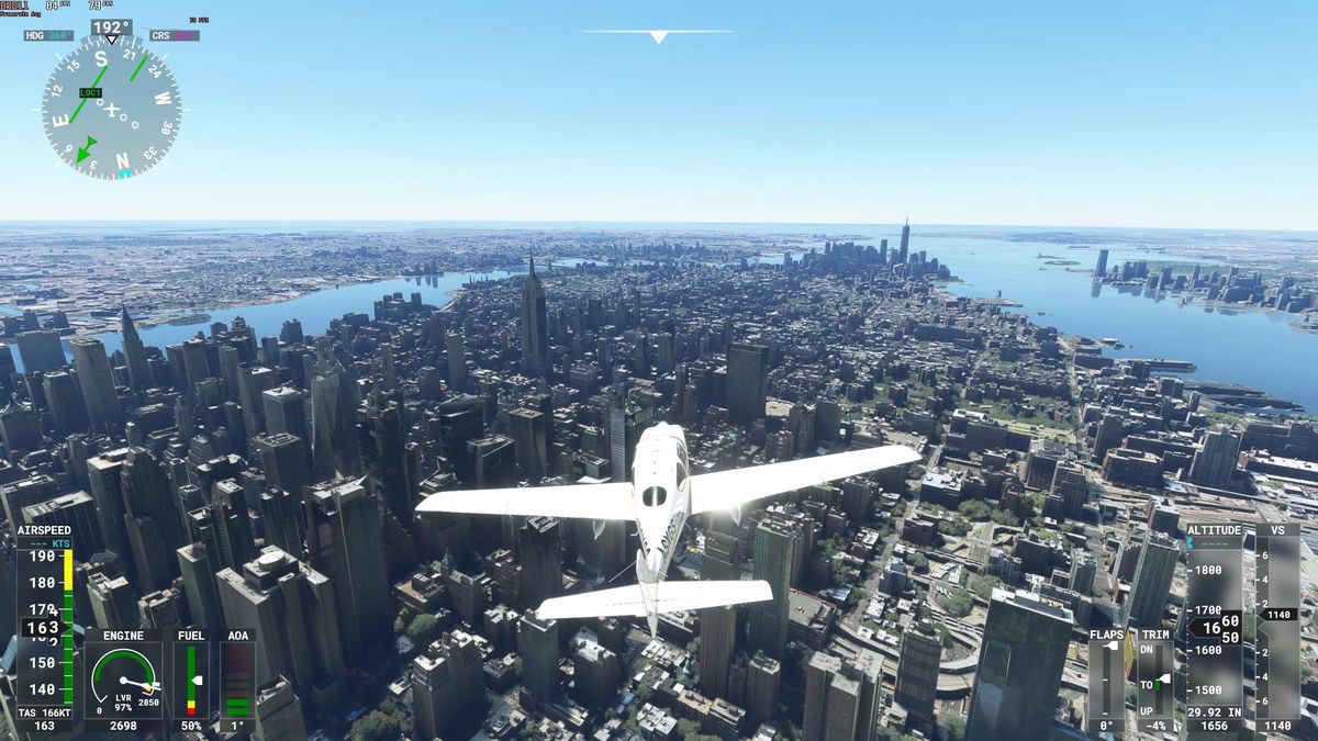 Chiar și zborul prin zone precum New York City vede unele îmbunătățiri impresionante, mașina mea reușind acum să atingă media de 80 fps în ceea ce este de obicei o parte foarte exigentă a Microsoft Flight Simulator. Îmbunătățirile sunt atât de surprinzătoare încât a trebuit să verific dublu și triplu setările pentru a mă asigura că rulez de fapt la ultra pe toate.