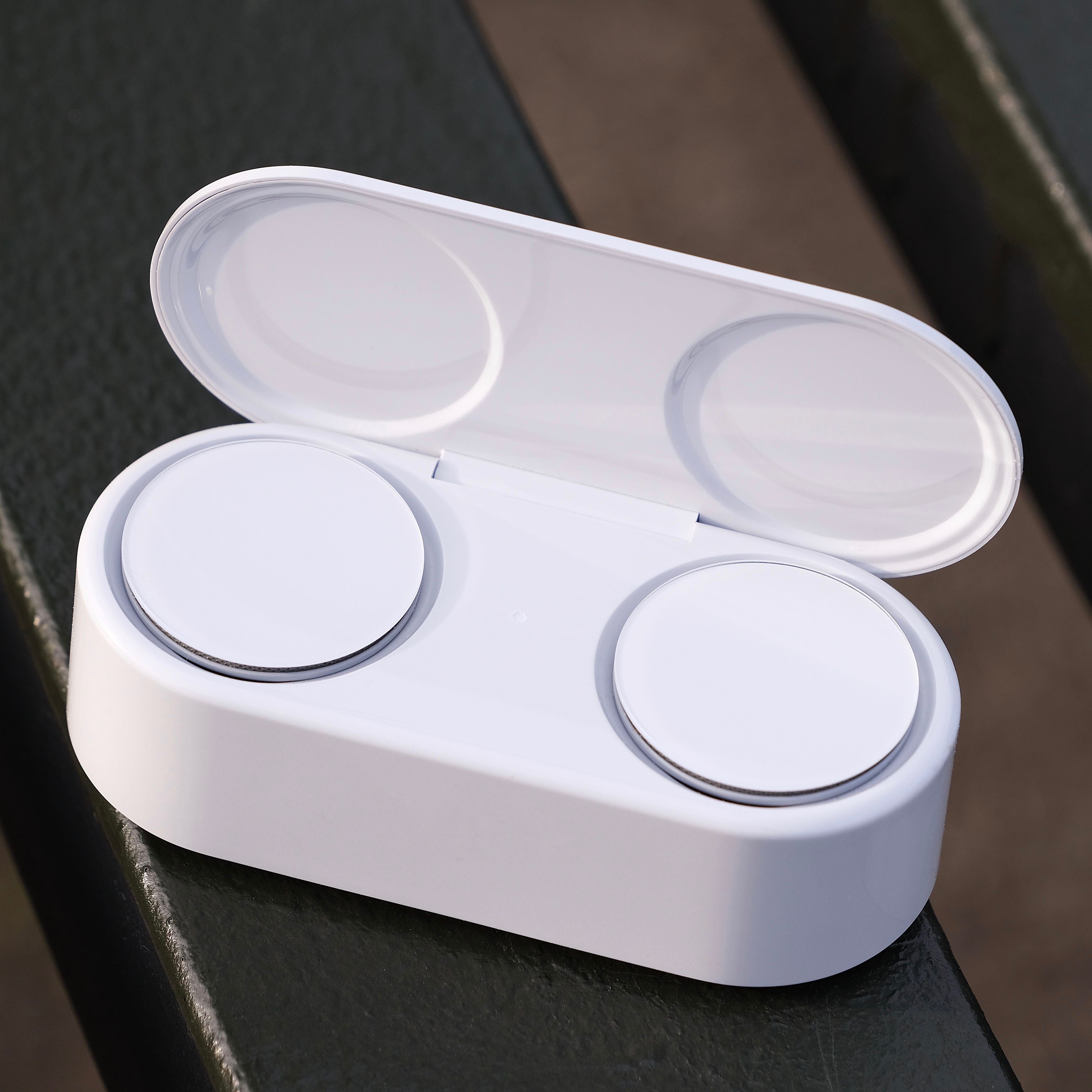 Căștile de suprafață vin într-o carcasă lucioasă, în formă de pastilă, cu sigla Microsoft în partea de sus. (Căștile în sine nu au nici o marcă.) Cazul meu a ieșit cam scos din cutie, ceea ce a fost dezamăgitor, dar culoarea gri deschis a ascuns aceste zgârieturi suficient de bine. Există un port USB-C în spate, un buton de asociere în partea de jos și aceasta este amploarea cazului. Din păcate, nu are capacități de încărcare wireless. Dar cu o înălțime sub un centimetru și o lățime mai mică de trei centimetri, este foarte buzunar.