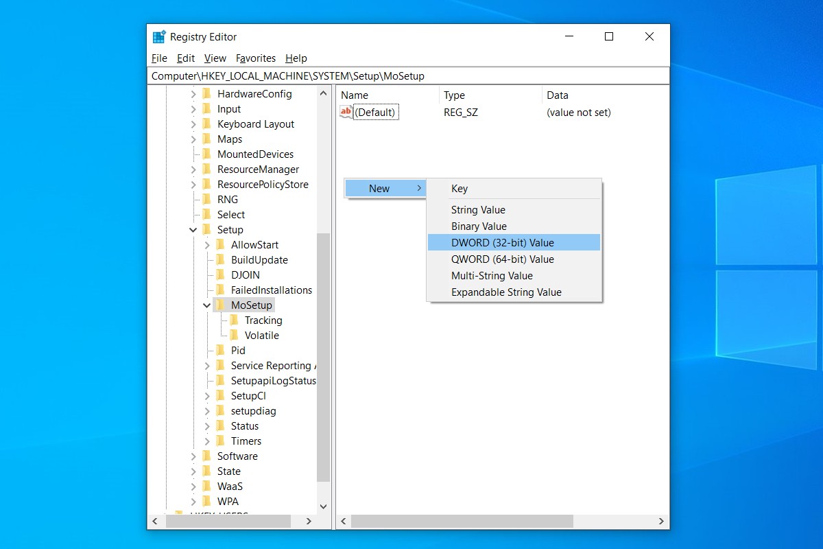În Windows, apăsați start și tastați regedit, apoi apăsați Enter pentru a lansa Editor de registru. Navigheaza catre Computer HKEY_LOCAL_MACHINE SYSTEM Setup MoSetup, fie prin lipirea acelei adrese în caseta de sub „Fișier, Editare, Vizualizare, Preferințe, Ajutor” sau prin forarea în jos prin HKEY_LOCAL_MACHINE și Sistem și Înființat și MoSetup dosare pe rând.