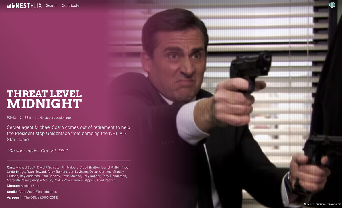 Într-un tweet care anunță proiectul, Fisher îl descrie ca „doar un wiki care face ceva cosplay”, care îl subînvinde sincer. Nestflix este minunat de detaliat, cu o funcție de căutare funcțională, liste de distribuție pentru fiecare proiect și informații despre spectacolul sau filmul real în care au apărut inițial emisiunile sau filmele false. Este perfect pentru spectacole precum 30 Rock, care a existat în esență pentru a crea înșelăciuni media de tip aruncabil Insula Milf sau Salt Dave Williams, dar chiar și falsuri mai vechi ca Îngeri cu suflete murdare din Singur acasa face aparitie.