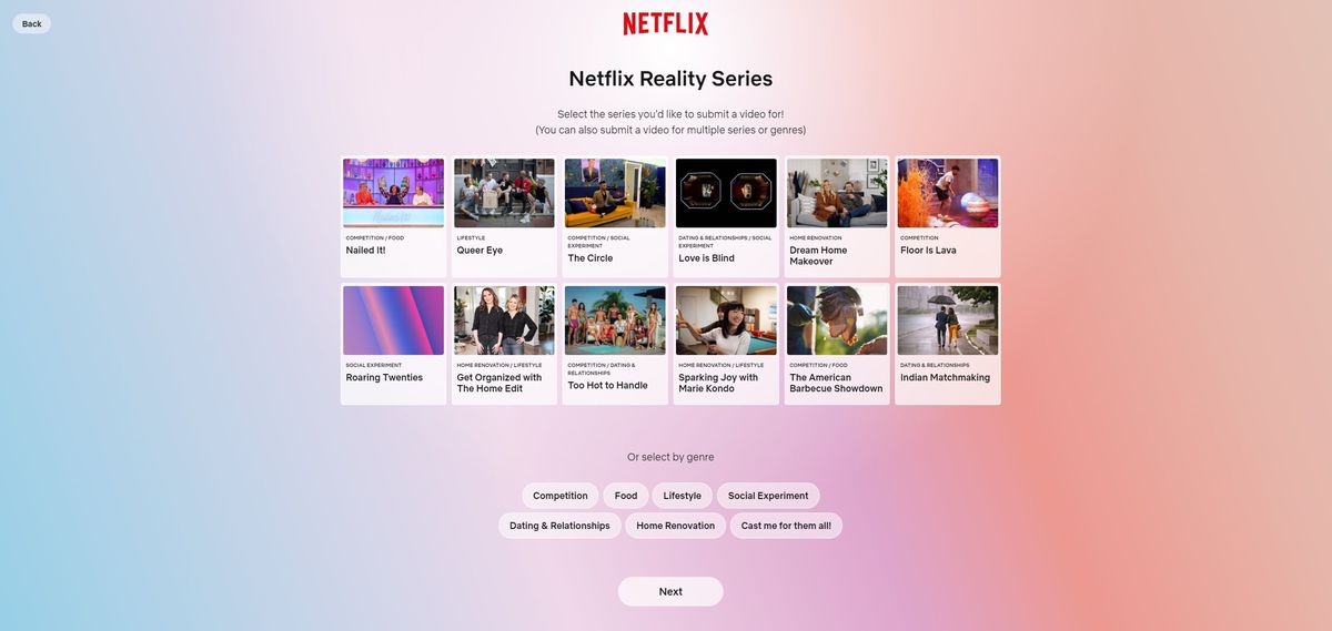 Oricine este interesat, care îndeplinește aceste criterii, poate trimite un videoclip de un minut pe noul site dedicat realității TV Netflix. Aplicația poate fi utilizată pentru mai multe spectacole pe lista actuală a Netflix, de la concursuri de copt precum Tras-o! la opțiuni romantice mai sărace cum ar fi Dragostea e oarba. (Netflix oferă, de asemenea, opțiunea de a aplica la toate spectacolele sale simultan dacă preferați o abordare mai „spaghetti întâlnește peretele”.)
