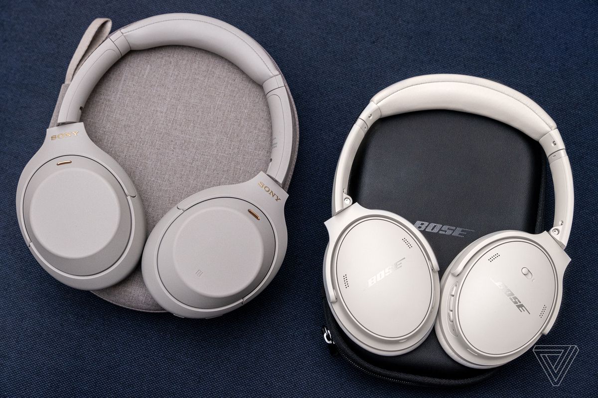 Căștile Sony WH-1000XM4 în stânga, Bose QC45 în dreapta.