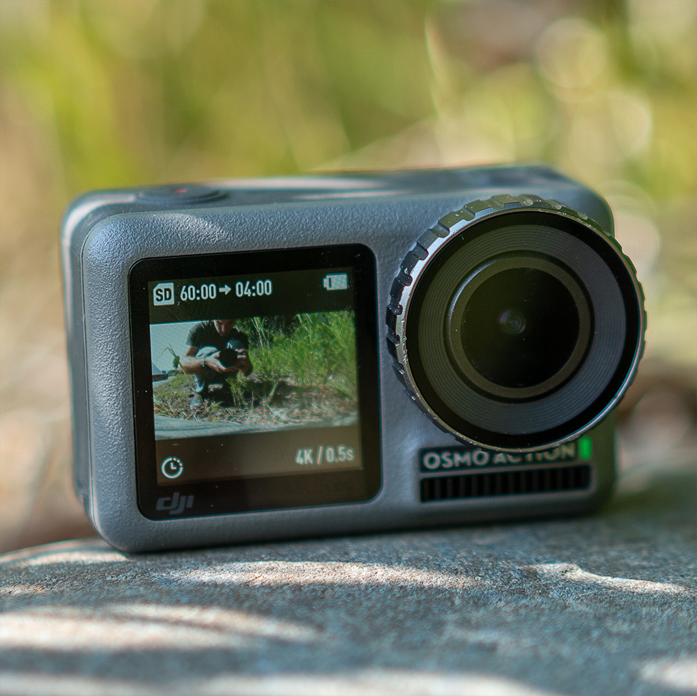 Să începem cu elementele de bază. Acțiunea Osmo seamănă cu un GoPro. Are aceeași formă întunecată, cutie, cu un obiectiv în stânga. În spate, ca și în cazul Hero7, există un ecran tactil. Osmo’s este un ecran mai larg 16: 9 (Hero7 este 4: 3), ceea ce vă oferă o imagine mai mare, dar ecranul este mult mai slab decât GoPro, pe care l-am găsit frustrant în lumina puternică a soarelui. Cea mai mare diferență fizică este că Osmo Action are și un ecran pe partea din față a camerei. Este un pătrat mic, de 1,4 inci, deci nu puteți vedea o tonă, dar, în general, este suficient de bun pentru a vedea dacă silueta dvs. este în cadru sau nu. Cu siguranță la îndemână.