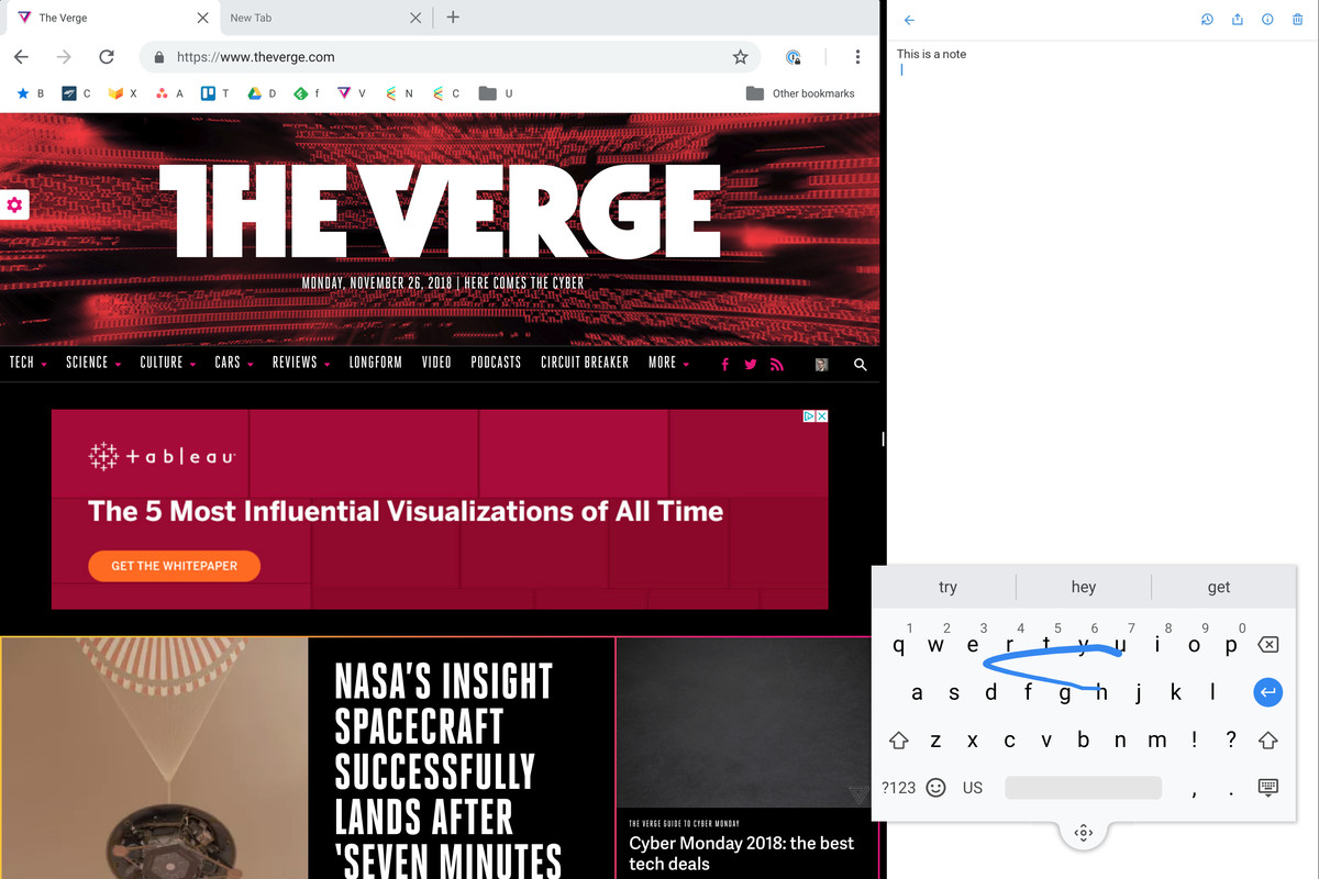 Alte bug-uri sunt doar un fel de enervant. Când tastatura este atașată, mișcarea ferestrelor se simte relativ rapidă și netedă, chiar și cu câteva aplicații Android și peste 20 de file sau aplicații web deschise. Dar comutați Pixel Slate în modul tabletă și începeți să folosiți gesturile de glisare și se transformă într-o mizerie stutteră și întunecată. Introducerea cu Pixelbook Pen este la fel de imprevizibilă: uneori este bine; alteori, este atât de rău în Google Keep încât trebuie să renunț la aplicație și să încerc din nou.