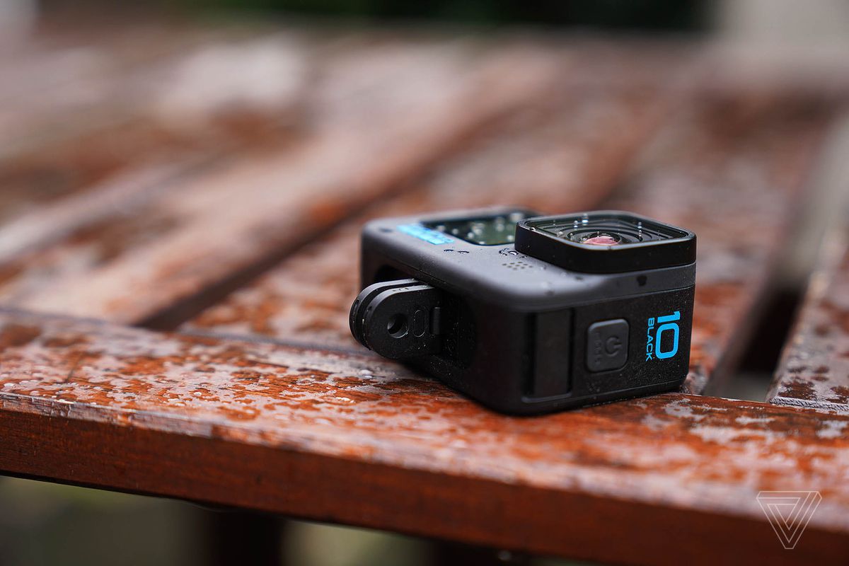 Deși GoPro susține că Hero10 este cu 3% mai ușor decât Hero9 (153g vs. 158g), se simte identic în mâinile mele. Singura caracteristică distinctivă dintre cele două modele este etichetarea albastră de pe Hero10, față de decalcomanii argintii de pe Hero9. Există un finisaj de cauciuc care se aderă; grinzi de montare depozitabile; două butoane fizice din cauciuc pentru alimentare, comutare de mod și înregistrare; două ecrane; și o baterie cu blocare, port USB-C și compartiment pentru slot pentru card microSD. GoPro susține că capacele detașabile ale lentilelor sunt mai rezistente la zgârieturi și mai rezistente la apă, producând în același timp mai puține imagini fantomă. Nu am avut probleme cu capacul lentilei lui Hero9, dar mai multă protecție este întotdeauna binevenită.