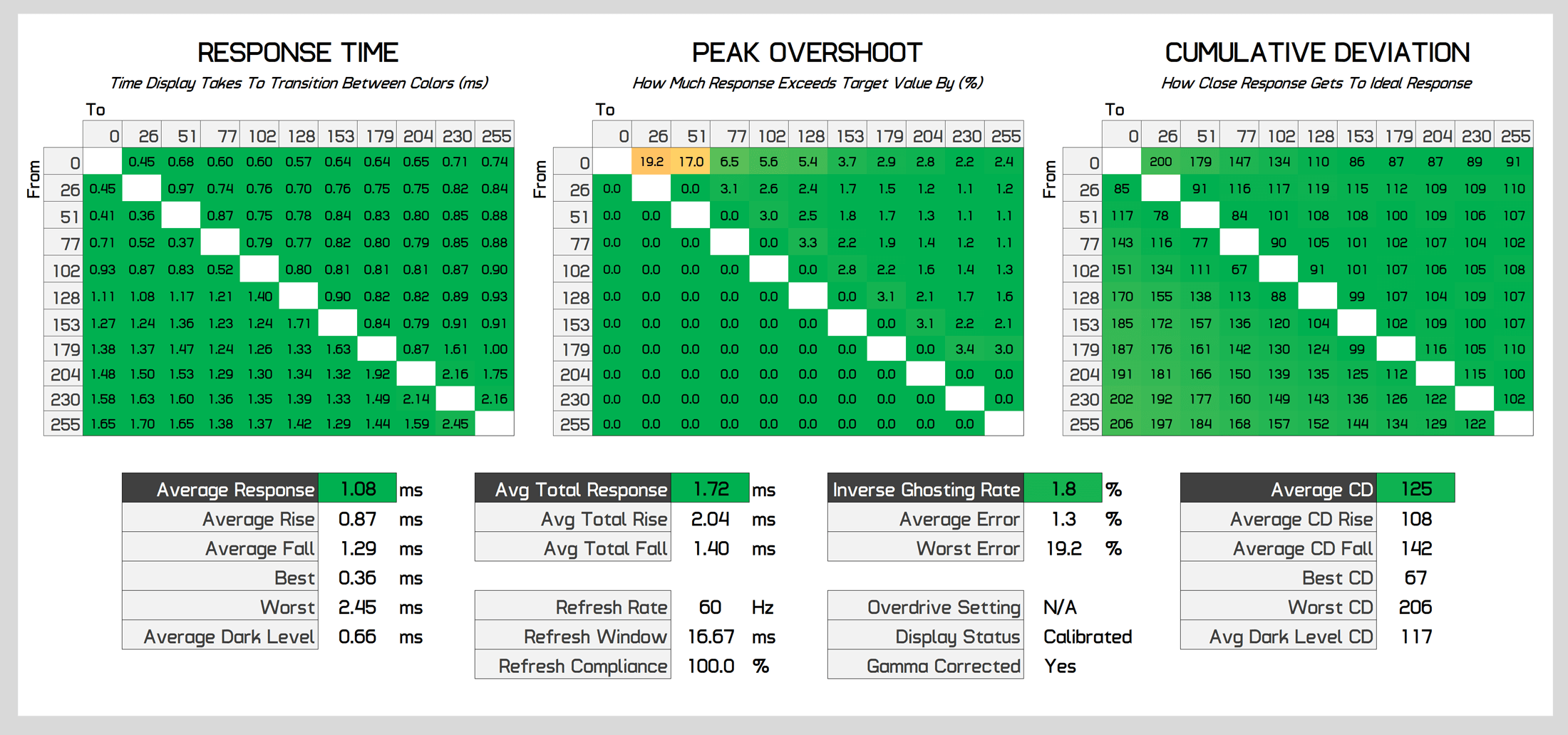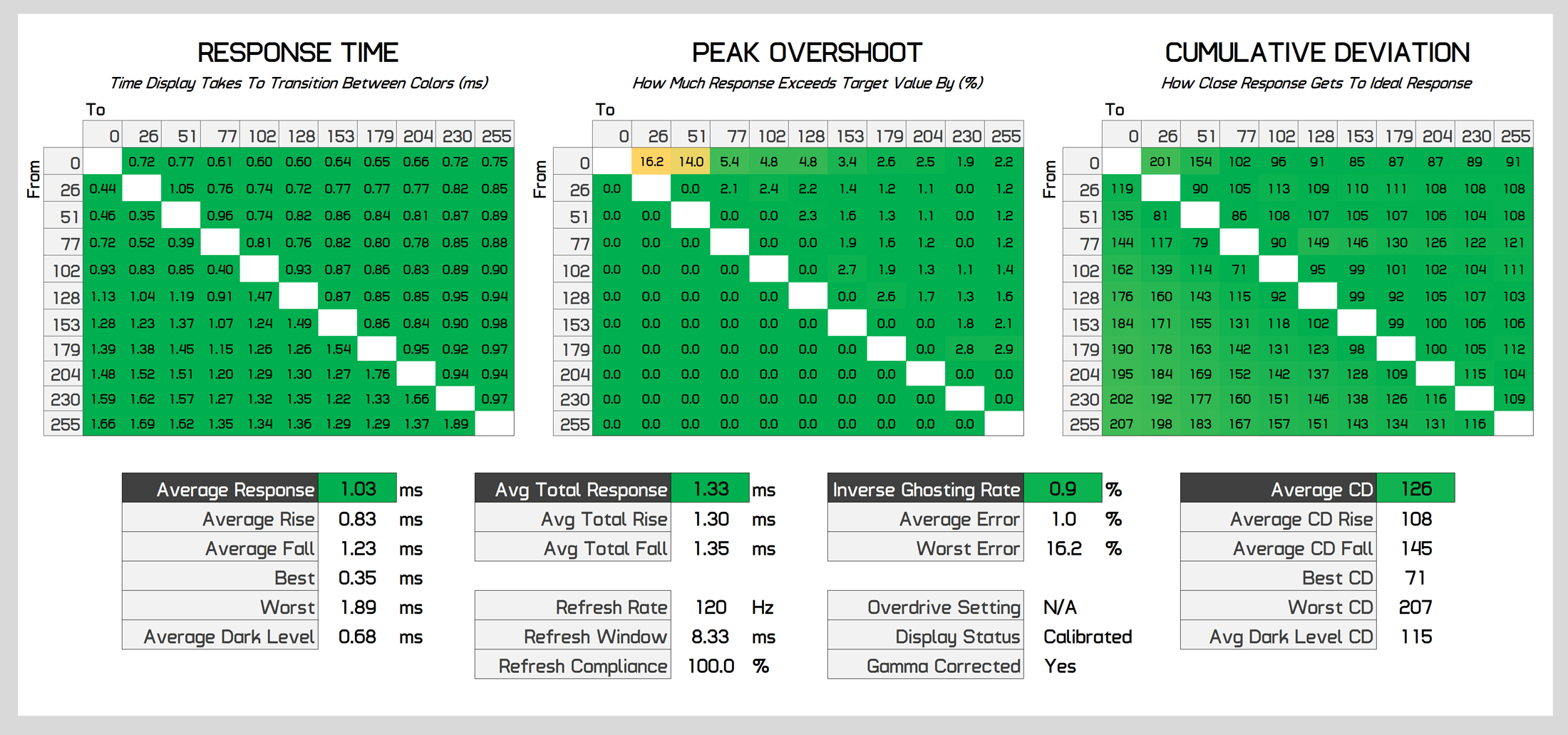 Unul dintre beneficiile inerente ale OLED-ului este viteza, oferind un răspuns mediu de 1 ms și o depășire neglijabilă, ceea ce duce la valori cumulative remarcabile ale deviației. Acest lucru este la fel de aproape de timpii de răspuns instantaneu pe care îi veți obține de la un afișaj în 2022 și pur și simplu nu veți vedea artefacte LCD tipice, cum ar fi ghosting, smearing sau inverse ghosting în practică.