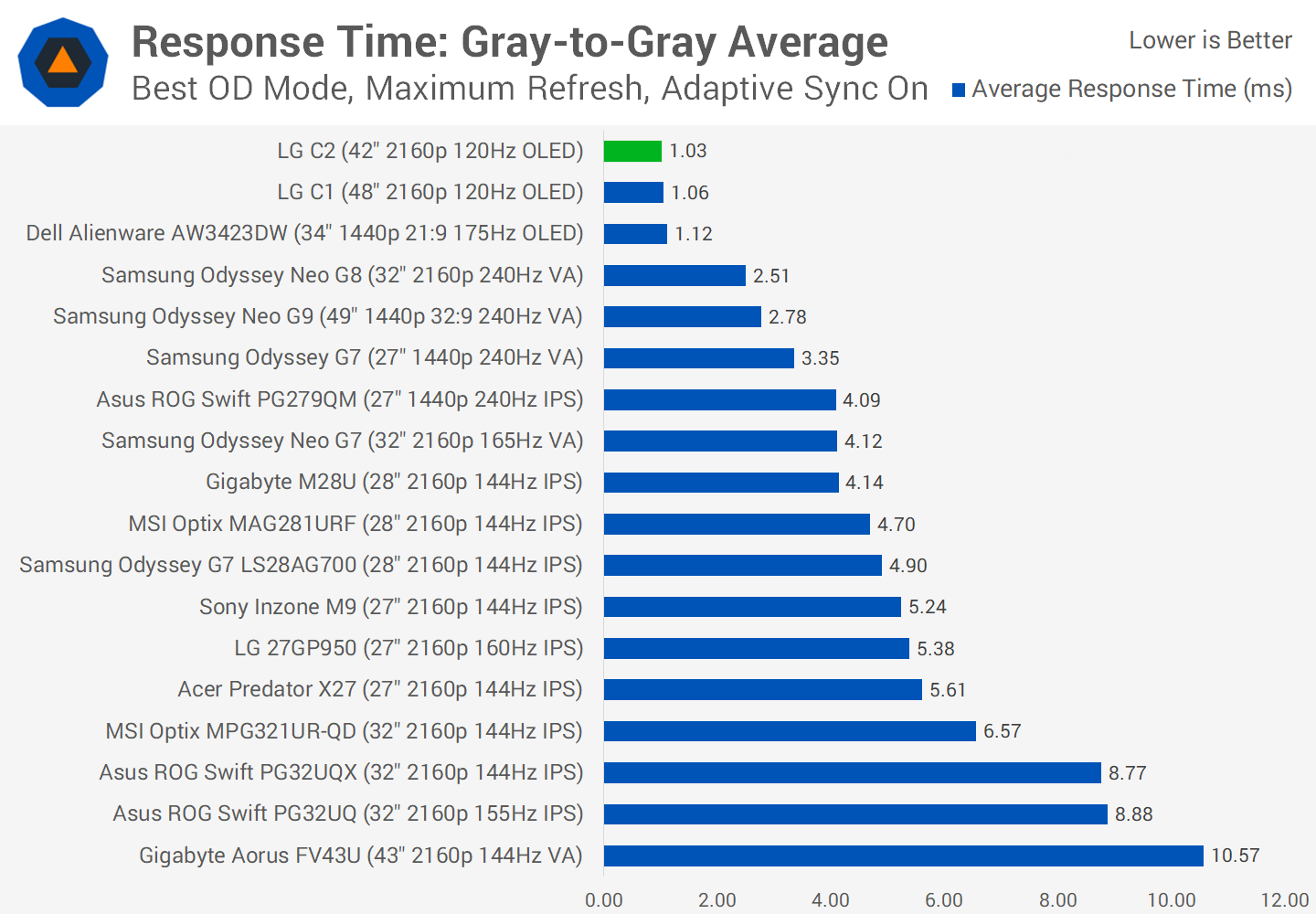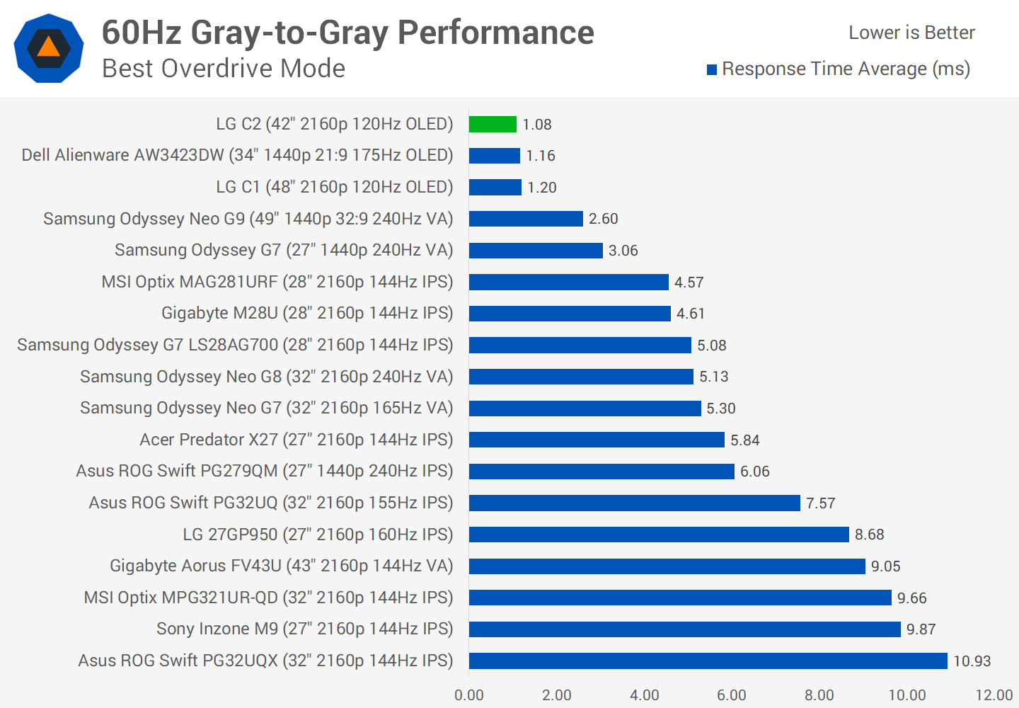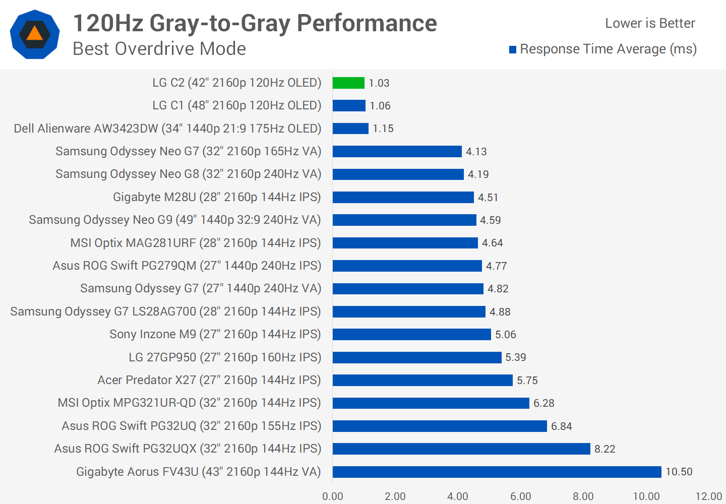 În comparație cu alte monitoare la rata maximă de reîmprospătare, LG C2 și alte OLED-uri sunt într-o clasă proprie. Nu numai că timpul de răspuns de 1 ms al lui C2 șterge un panou LCD tipic în timpii de răspuns, ci și cu o depășire neglijabilă. Samsung Odyssey Neo G8, de exemplu, este de 2,5 ori mai lent și are o depășire mult mai mare, oferind o experiență vizuală mai proastă – iar Neo G8 este excelent în ceea ce privește LCD-urile. În comparație cu LCD-urile mai obișnuite, C2 este în intervalul de 4 până la 5 ori mai rapid.