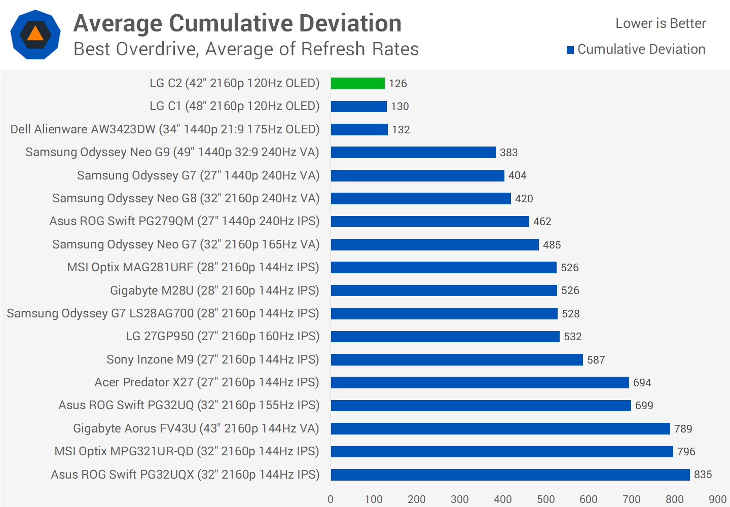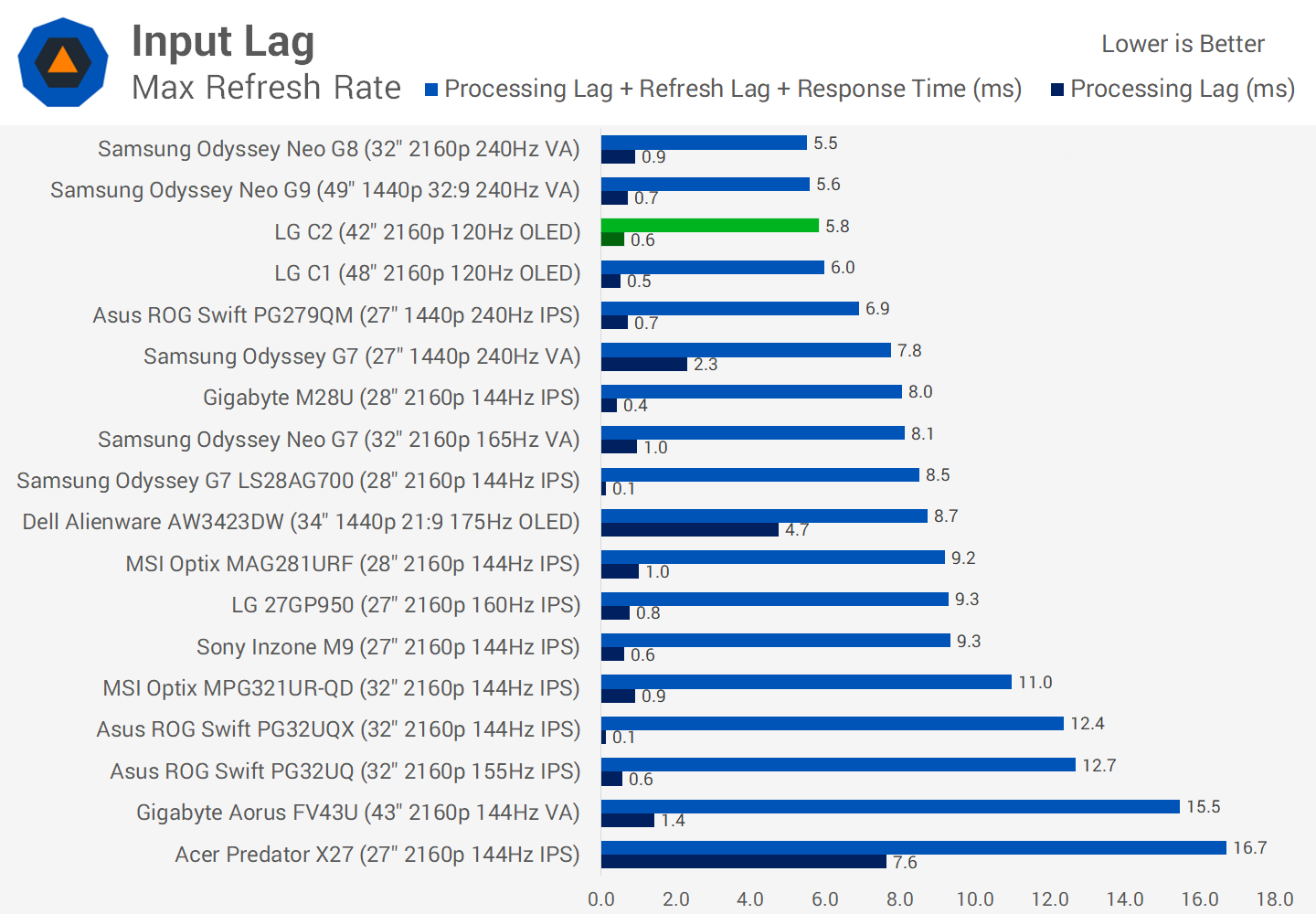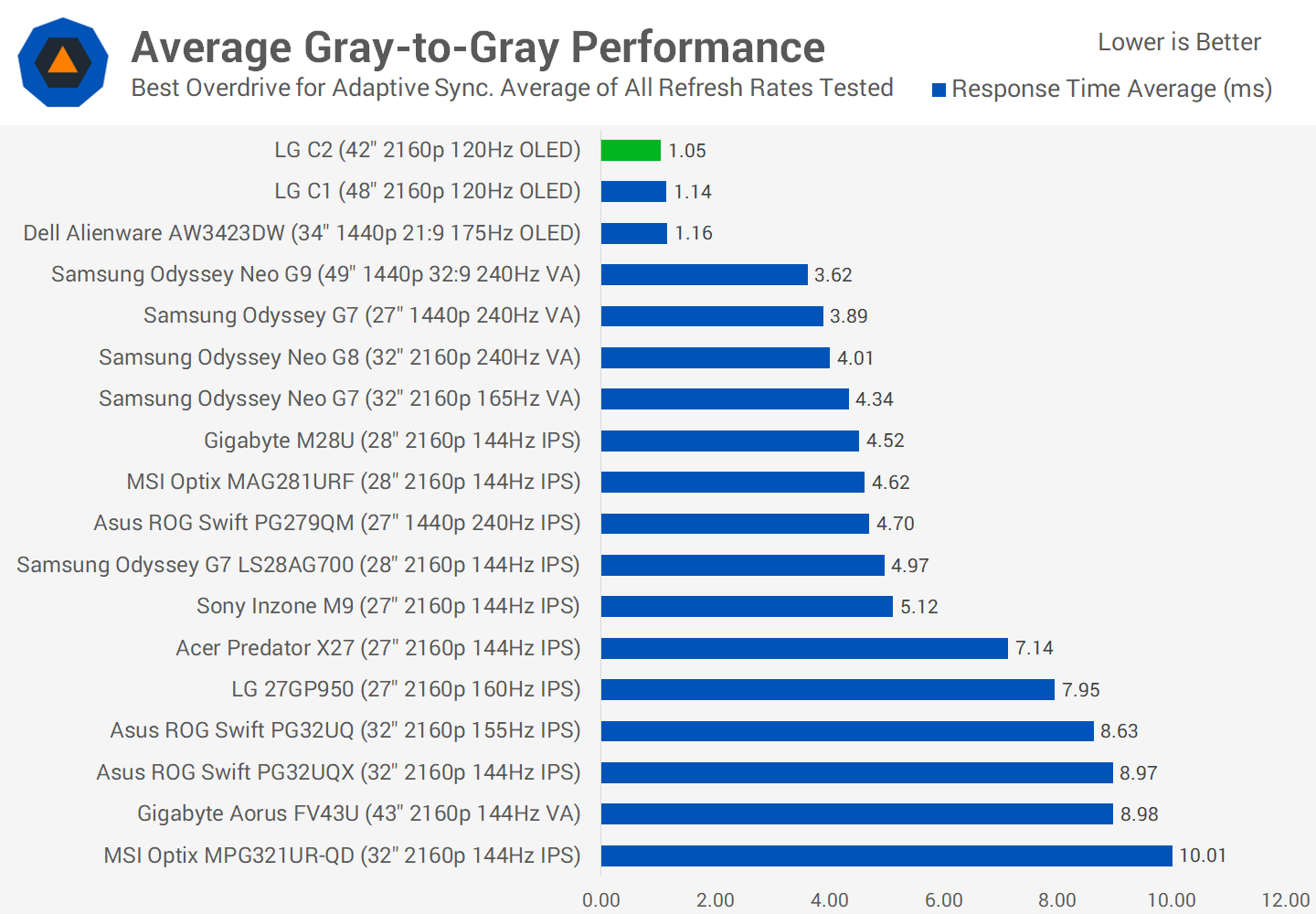 În comparație cu alte monitoare la rata maximă de reîmprospătare, LG C2 și alte OLED-uri sunt într-o clasă proprie. Nu numai că timpul de răspuns de 1 ms al lui C2 șterge un panou LCD tipic în timpii de răspuns, ci și cu o depășire neglijabilă. Samsung Odyssey Neo G8, de exemplu, este de 2,5 ori mai lent și are o depășire mult mai mare, oferind o experiență vizuală mai proastă – iar Neo G8 este excelent în ceea ce privește LCD-urile. În comparație cu LCD-urile mai obișnuite, C2 este în intervalul de 4 până la 5 ori mai rapid.