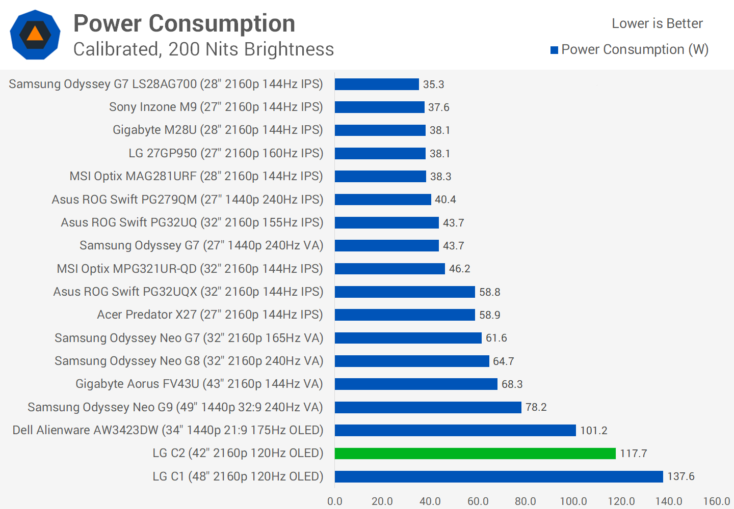 Consumul de energie este mare, deoarece testăm fiecare monitor folosind o imagine albă completă pentru acest test. C2 nici măcar nu poate atinge 200 de nitți, iar nivelul pe care îl produce înseamnă că consumă aproape 120 W de putere – o atingere sub dublul puterii Gigabyte Aorus FV43U de dimensiuni similare. Consumul obișnuit de energie în timpul conținutului din lumea reală este mai mic, dar totuși între 45 și 65 de wați în multe cazuri.