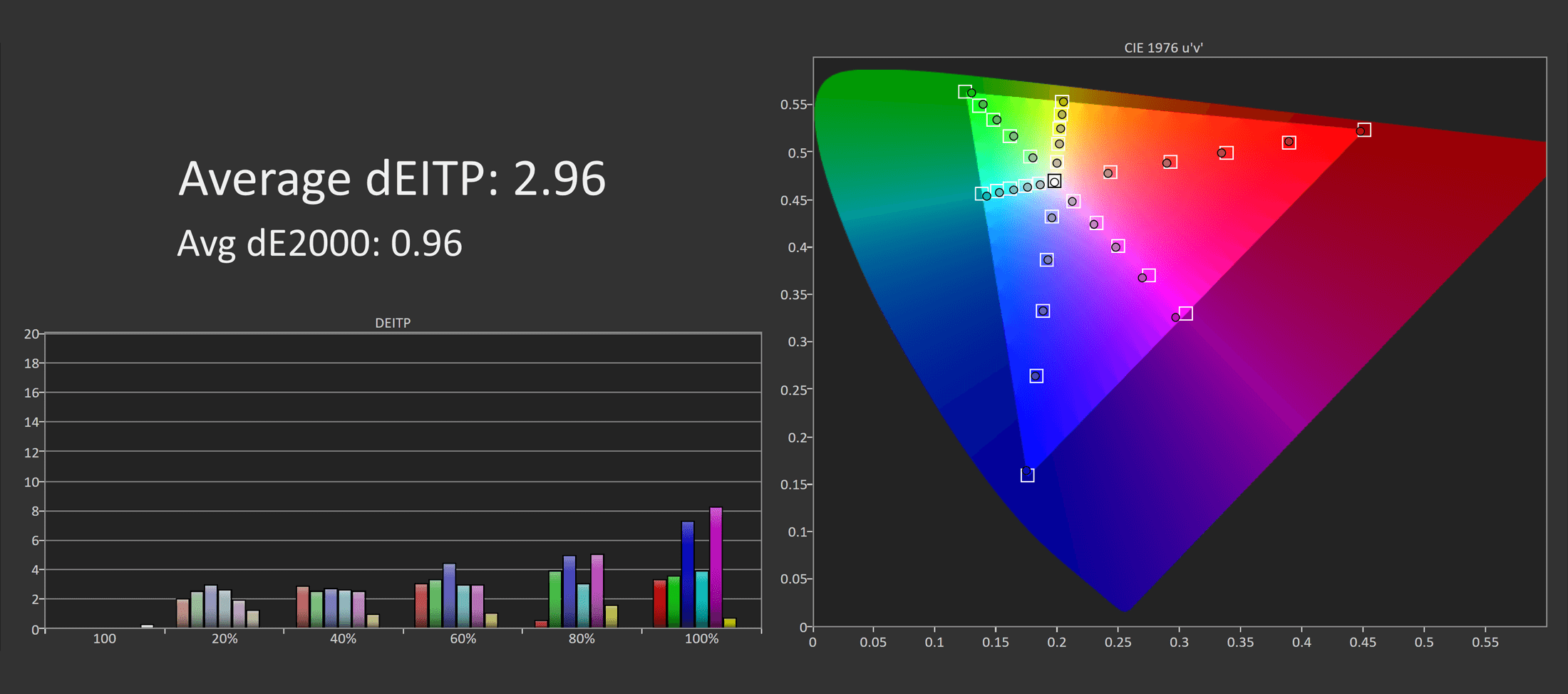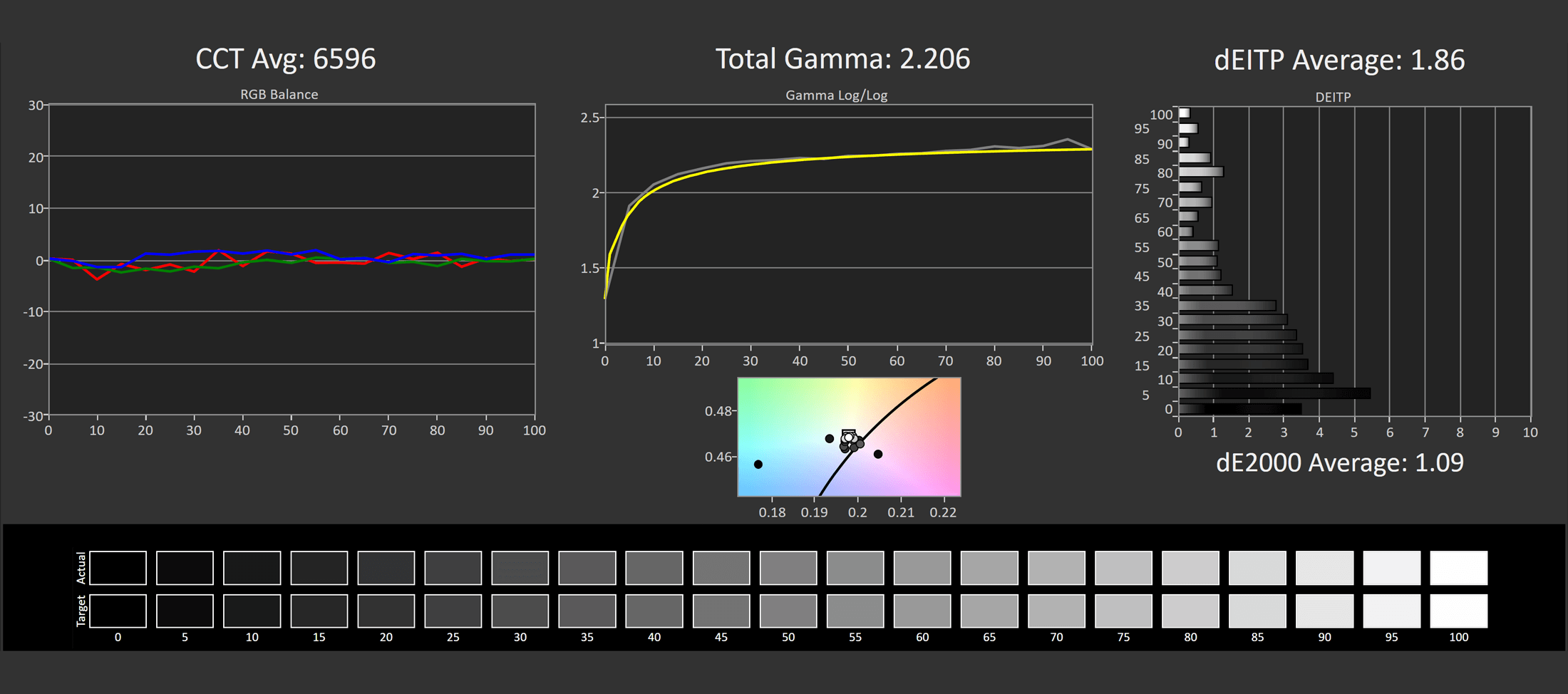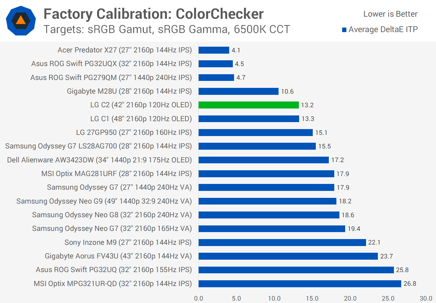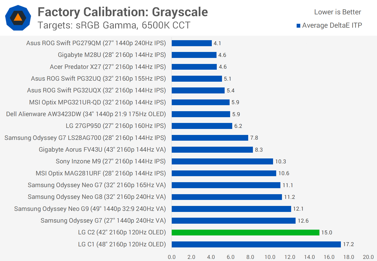 În comparație cu alte monitoare de gaming, C2 este printre cele mai proaste monitoare pe care le-am văzut pentru tonuri de gri din fabrică, oferind rezultate similare cu C1, LG chiar nu-i pasă de acuratețe în modul său implicit. Precizia ColorChecker este de la nivel mediu spre bun, deoarece acest afișaj este unul dintre puținele care limitează gama pentru conținutul SDR în mod implicit.