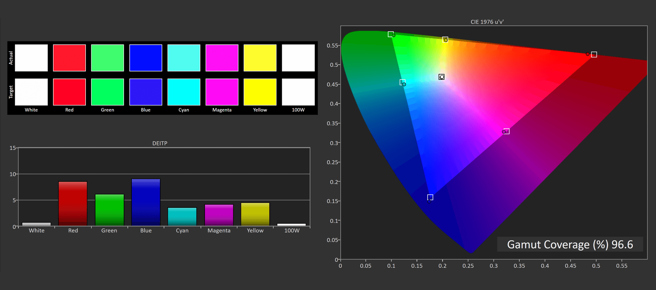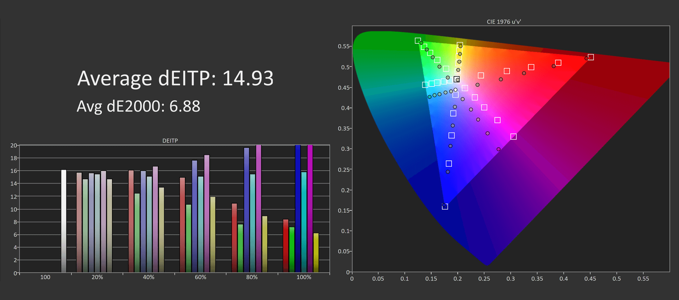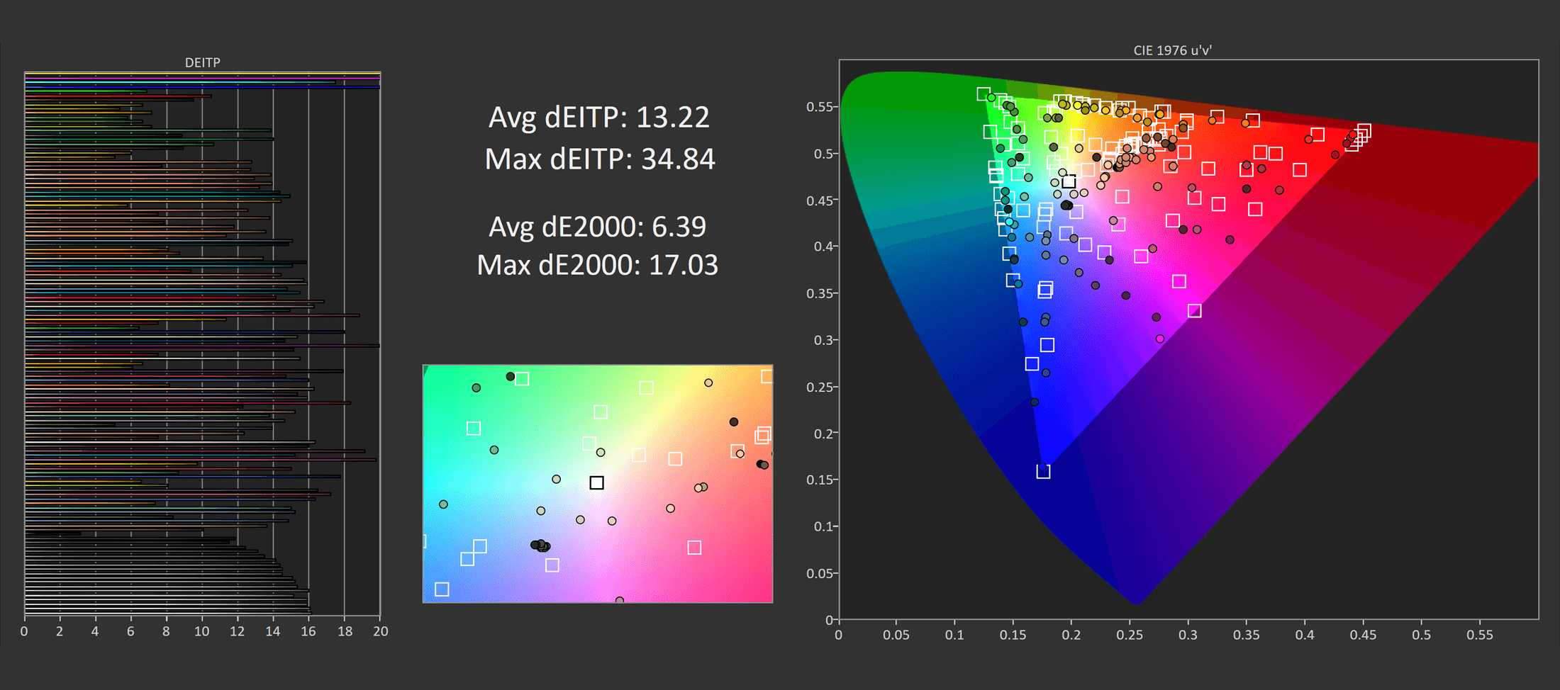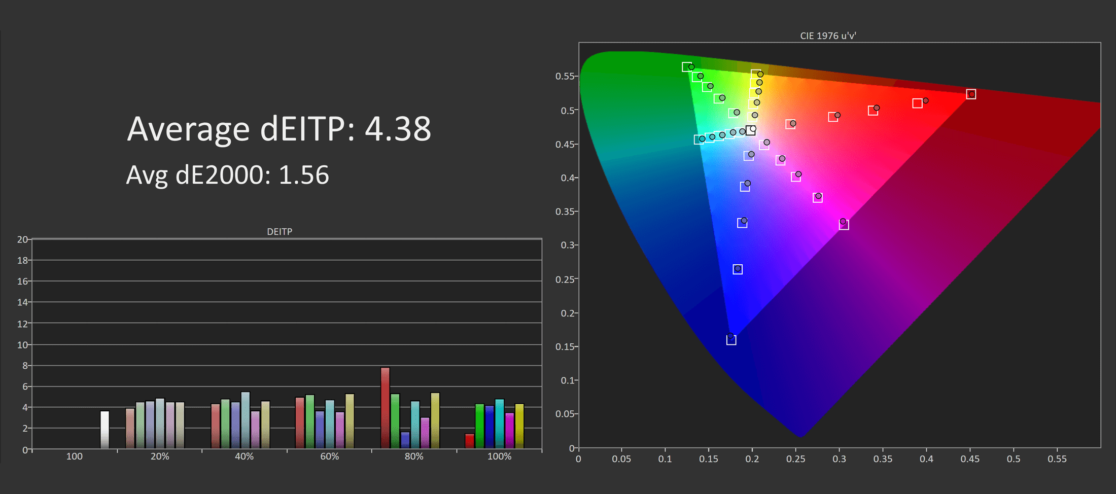 În comparație cu alte monitoare de gaming, C2 este printre cele mai proaste monitoare pe care le-am văzut pentru tonuri de gri din fabrică, oferind rezultate similare cu C1, LG chiar nu-i pasă de acuratețe în modul său implicit. Precizia ColorChecker este de la nivel mediu spre bun, deoarece acest afișaj este unul dintre puținele care limitează gama pentru conținutul SDR în mod implicit.