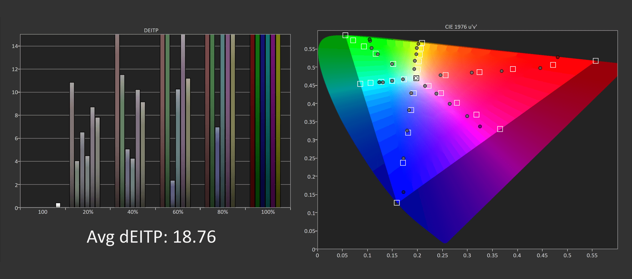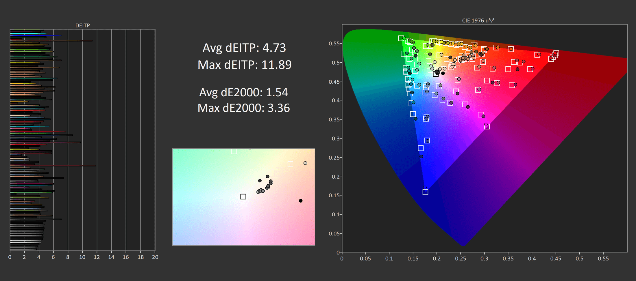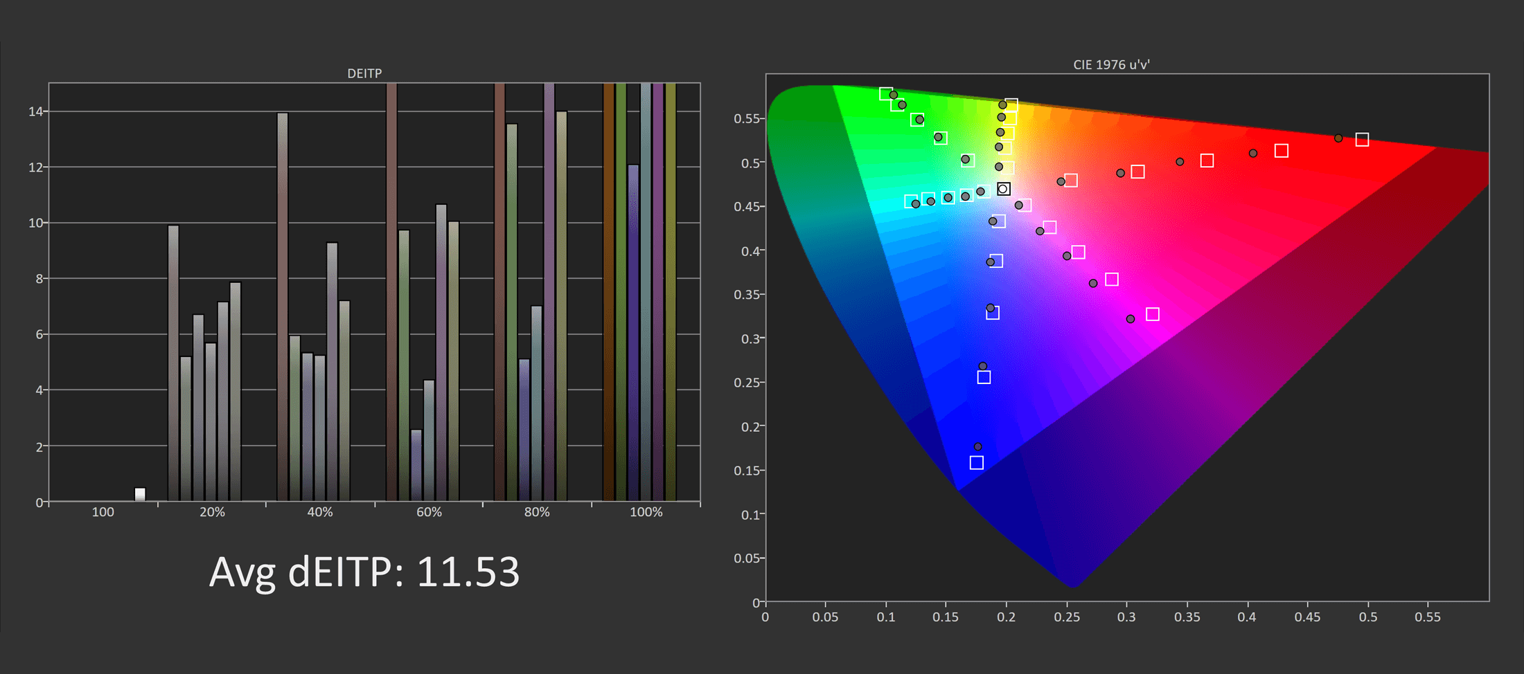 Pentru acuratețea HDR, C2 face o treabă bună de a urmări curba EOTF corectă, cu unele deplasări la capătul de sus și negru ușor inexact pentru o mică parte la capătul de jos al curbei. C2 menține acest nivel de precizie la o varietate de dimensiuni de ferestre, ceea ce este bun și ceea ce doriți să vedeți. Măsurările de saturație ar putea fi puțin mai bune, dar în general, C2 face o treabă bună în acest punct de referință.