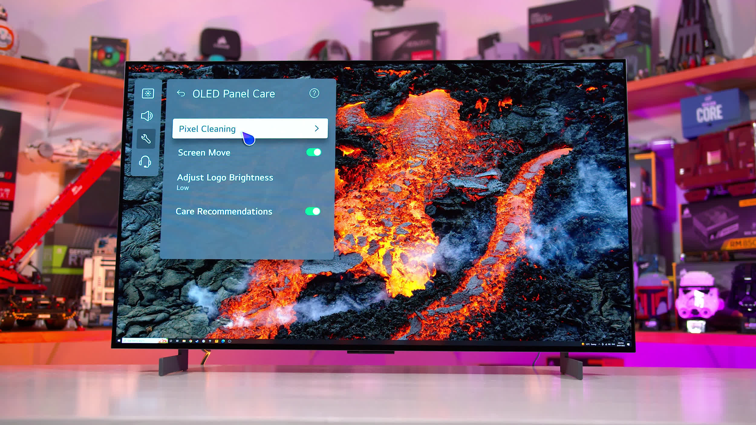 Există câteva strategii de atenuare în vigoare, dintre care unele C2 le activează singur și altele pe care le puteți face singur. De exemplu, C2 implementează deplasarea pixelilor și estomparea logo-ului pentru a îmbunătăți durata de viață a televizorului și estompează întregul panou atunci când sunt detectate perioade lungi de conținut static. Cu toate acestea, am considerat că funcția de deplasare a pixelilor este enervantă, deoarece poate tăia informații vitale de pe desktop uneori, în funcție de locul în care este mutată imaginea, așa că ar putea fi necesar să fie dezactivată pentru utilizarea desktopului, dăunând și mai mult arderea. De asemenea, recomandăm unele ajustări în Windows, cum ar fi utilizarea unui mod întunecat, activarea economizoarelor de ecran și setarea barei de activități pentru a se ascunde automat.