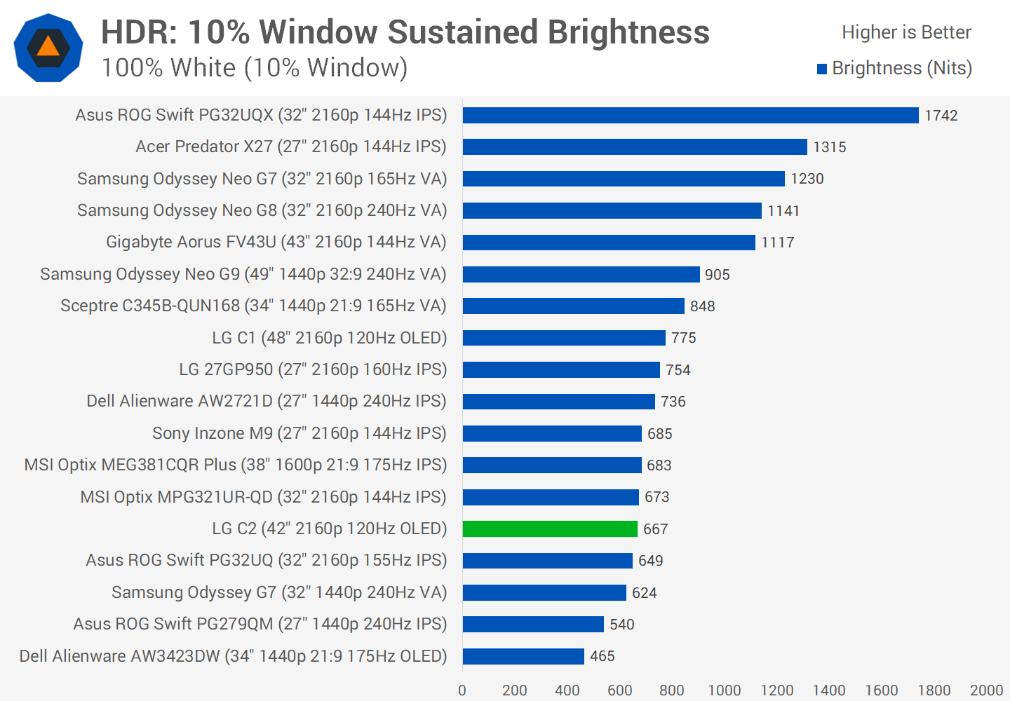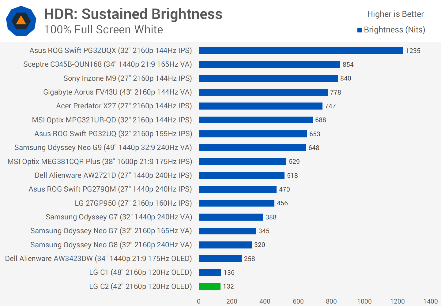 Cel mai slab aspect al calității imaginii este luminozitatea. Când se afișează o imagine albă completă, LG C2 OLED este un afișaj slab datorită limitatorului său automat de luminozitate sau ABL. Un rezultat de sub 200 de nits va fi insuficient în multe medii mai luminoase, iar atunci când este combinat cu un panou lucios, acesta nu este un rezultat grozav pentru reflexii.