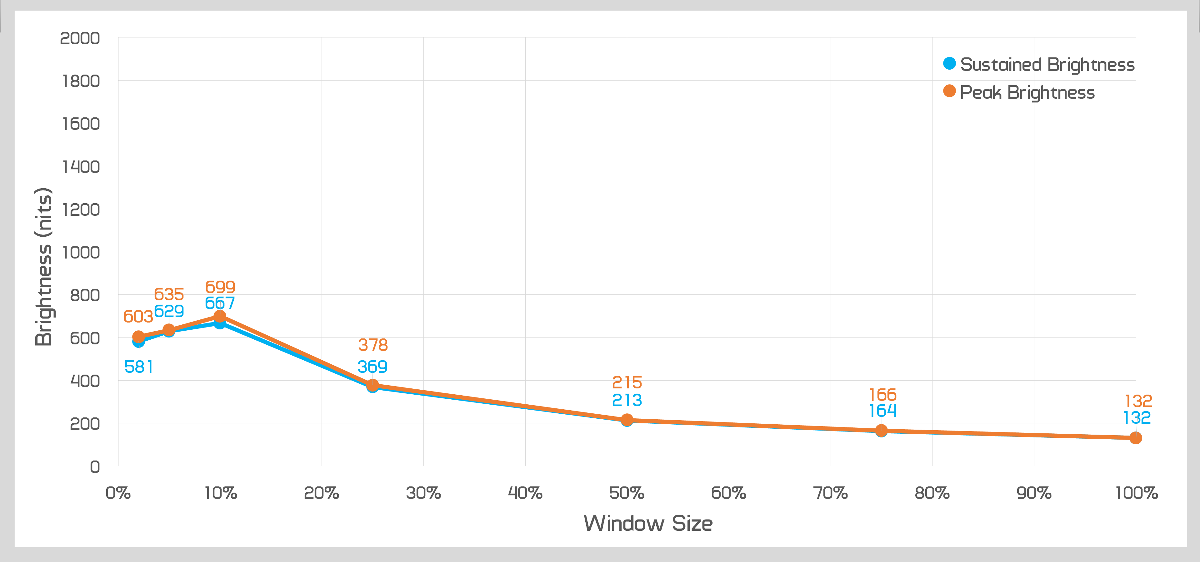 Acesta este modul în care LG C2 OLED gestionează luminozitatea pe diferite dimensiuni de ferestre. Orice scene cu un APL ridicat va fi relativ slabă, cu toate acestea, așa cum am discutat, C2 este capabil de luminozitate decentă în zone mai mici.